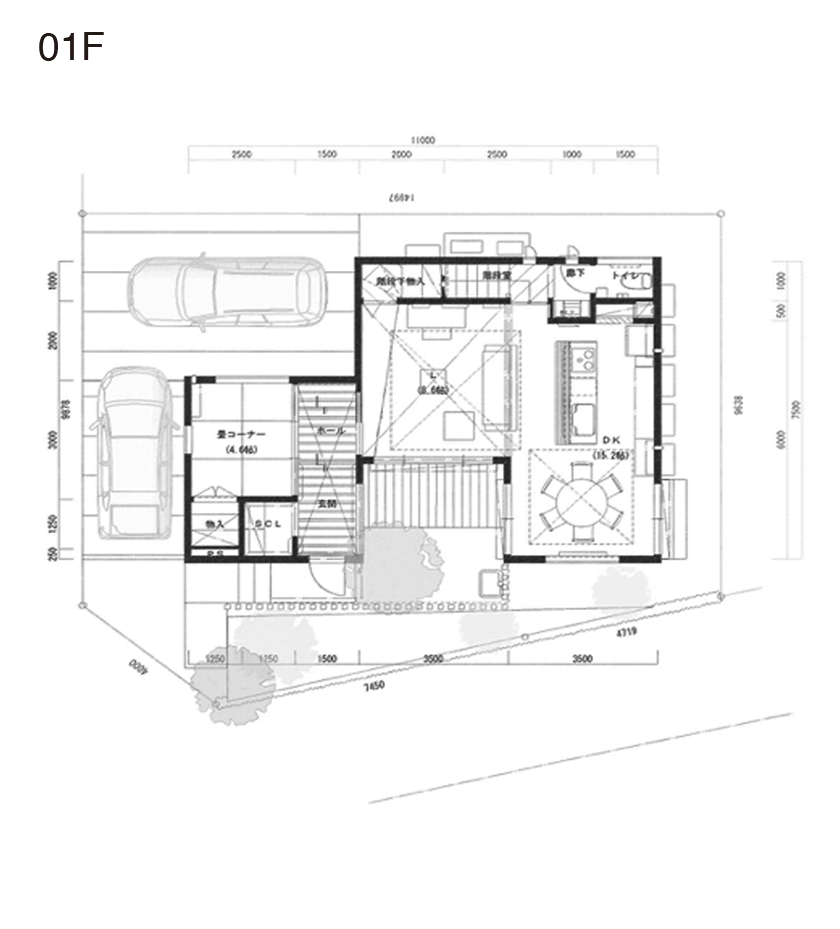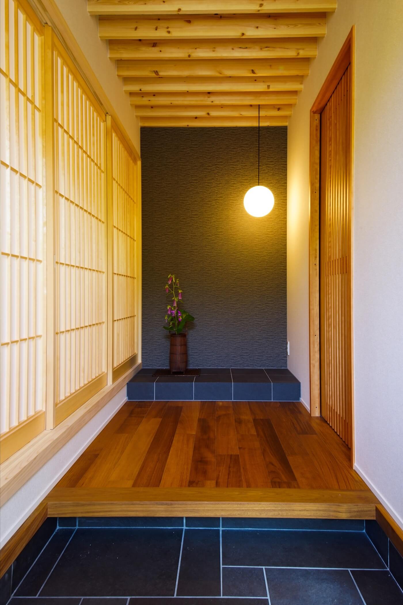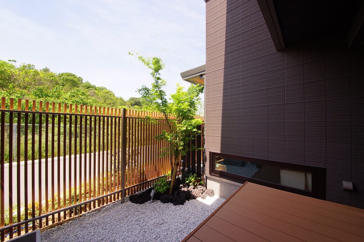 いくつか実例見学をした内の1件で、囲まれた中庭に流れるプライベートな時間と空間、カーテンの無い生活に憧れ、それを実現すべく、家づくりがスタートしました。真四角の家に比べて、凹字型の家は外周面積が多くなることから坪数としては割高になるため、コストバランスを考えながらの設計でした。プランの一番のポイントなる中庭を中心に、玄関、リビング、ダイニングを配置。床は、拘りのチークの挽板フロアを採用。また、リビングの天井は、暗く落ち着いた空間へ。そのため、無垢の天井材を使用。ダウンライトは設けず、間接照明を採用。足りない照度は、スタンドライトで補っています。また、リビングにブナコの照明、ダイニングには、トムディクソンの照明を採用。共働きというニーズから、水回りを二階にご提案。「洗濯」→「干す」→「片付ける」の動線をワンフロアで行えるようにしました。また、ご主人のお仕事柄、家に持ち帰ることもあるので、書斎を設け、お子様が悪戯をしないように鍵も設けてあります。真っ黒な陶器の外壁と軒の深い外観がドシと和の邸宅感を演出しています。