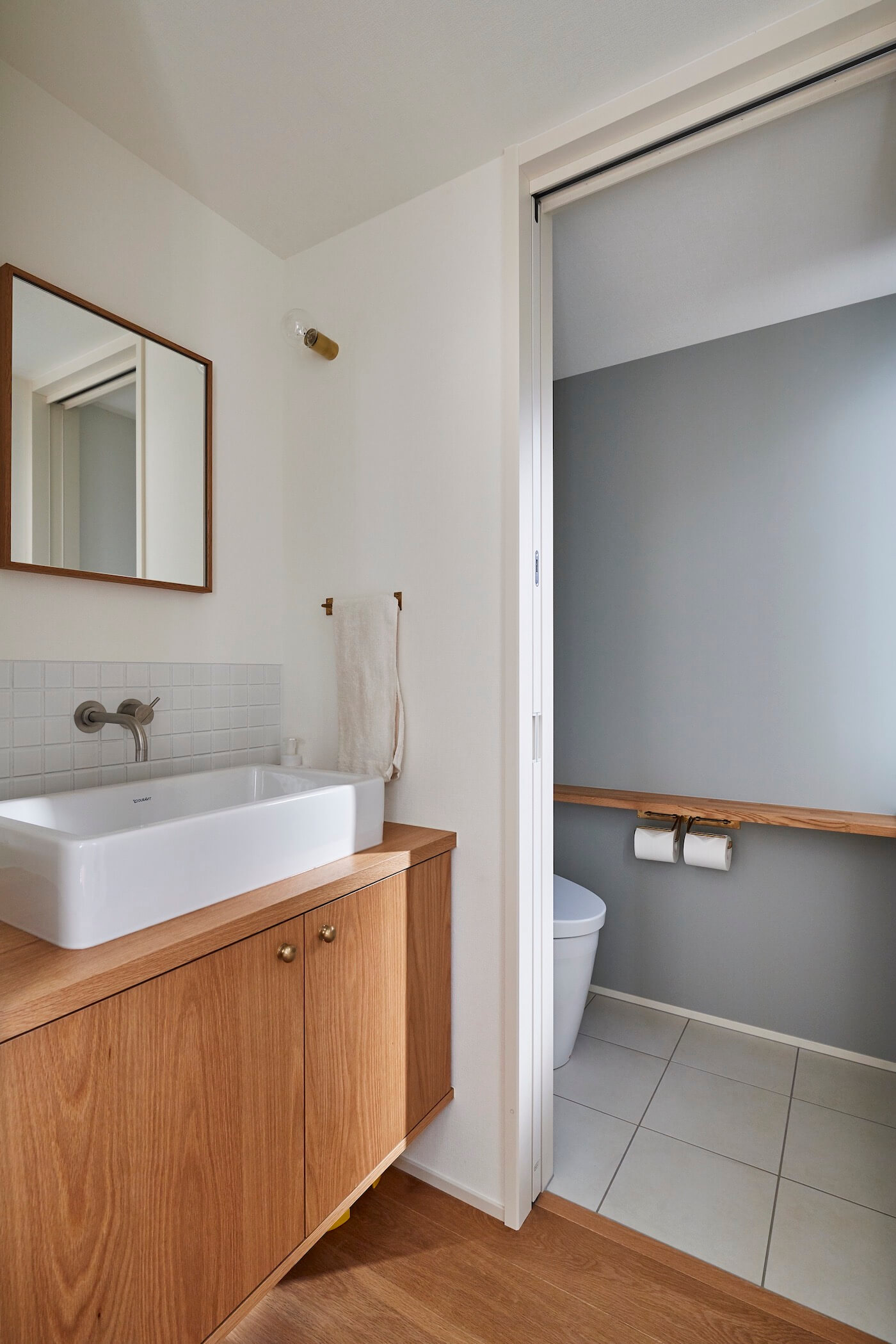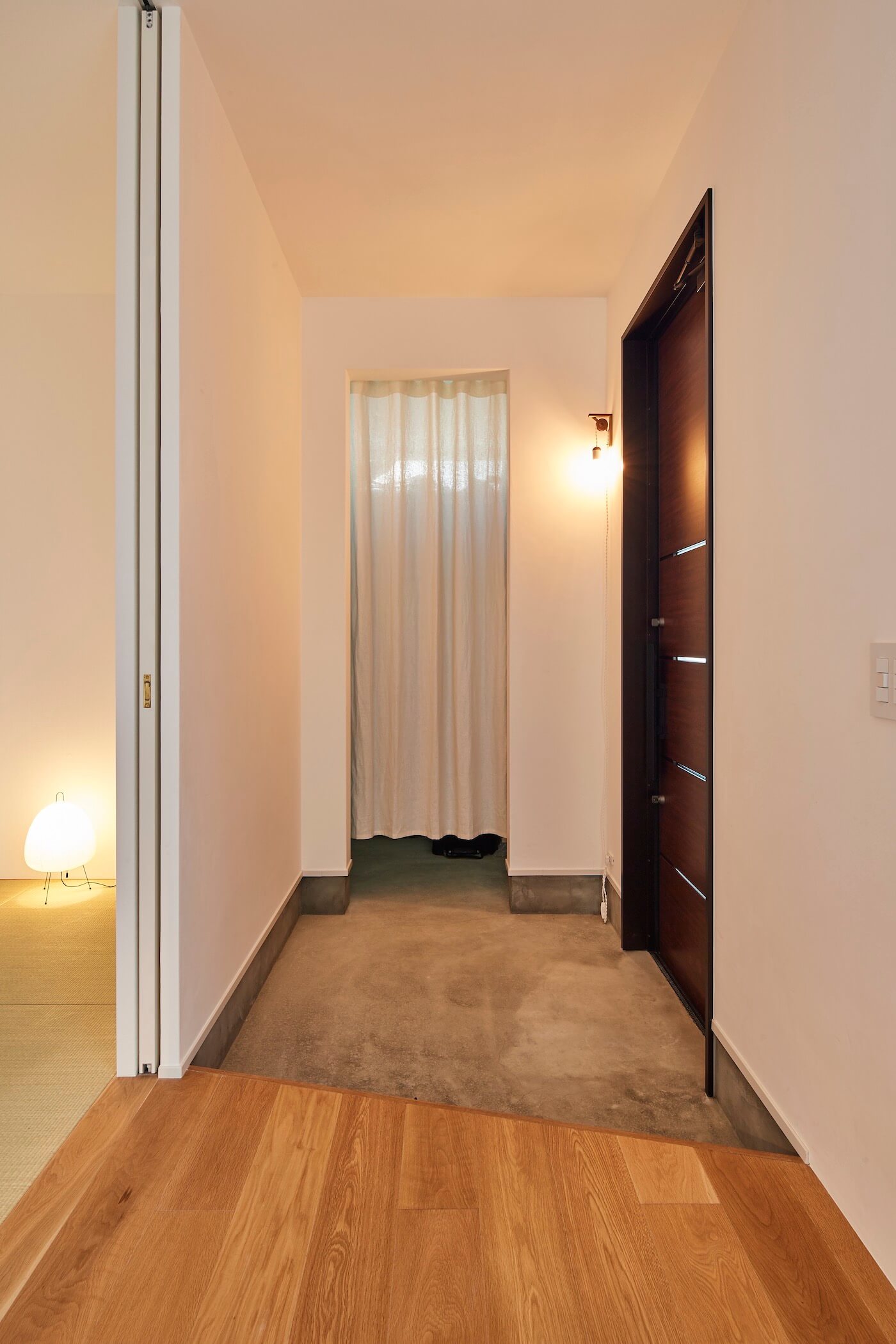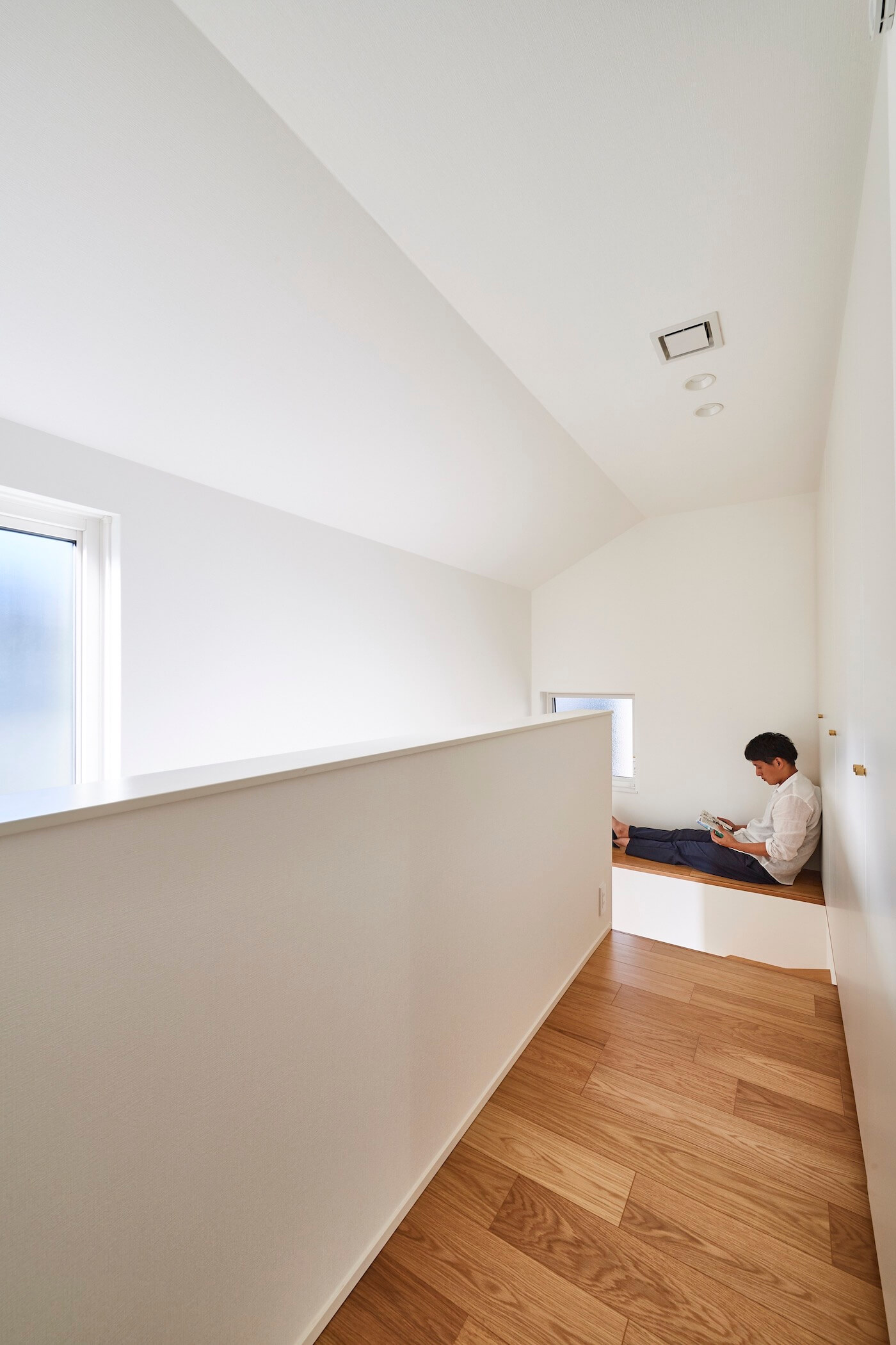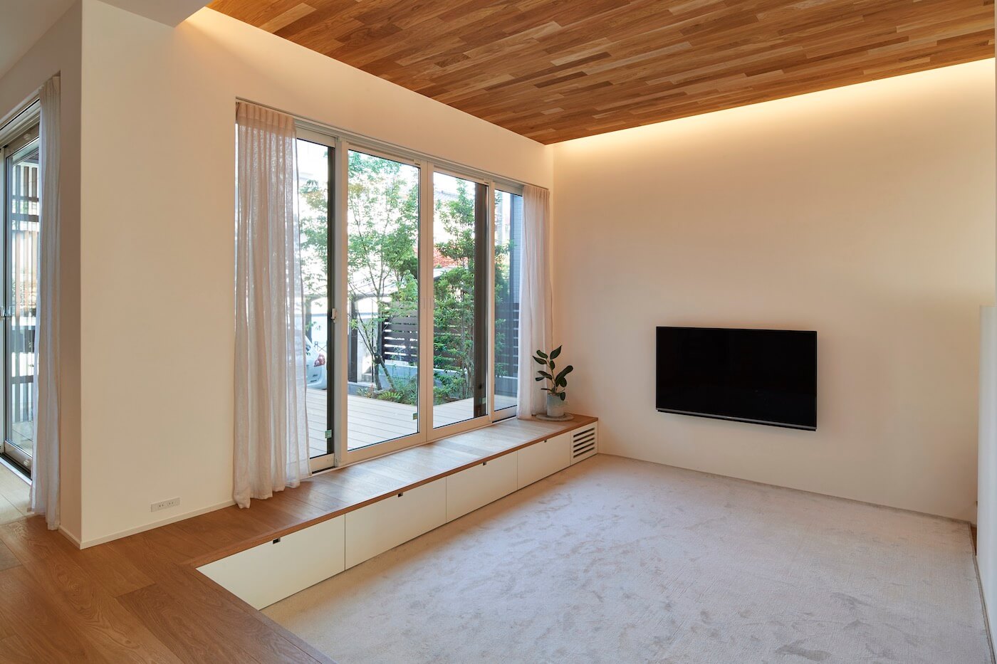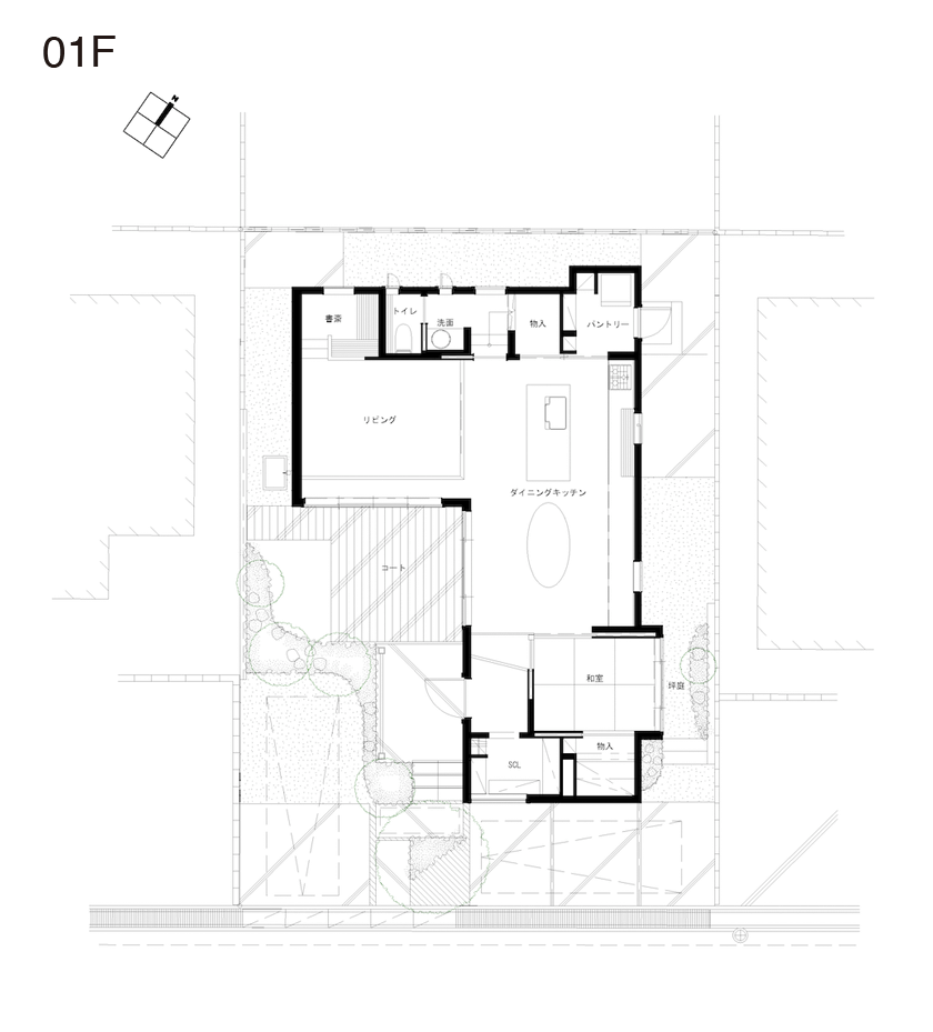 当敷地は25年程前に開拓されたニュータウンの一画で、閑静な住宅地に位置します。周囲は2階建住宅が立ち並び、道路向かいの宅地は1m程宅盤が高くなっています。プライバシーをしっかり確保したいというご要望も有り、L型コートハウスを計画。ただ目隠し塀で囲うのではなく、LDK・庭に居て気持ち良く感じて頂けるよう植栽を多く用いて庭を囲う構成としました。柔らかく周囲の視線を遮り、周りを気にせず緩やかな時間を過ごして頂けるよう心掛けました。