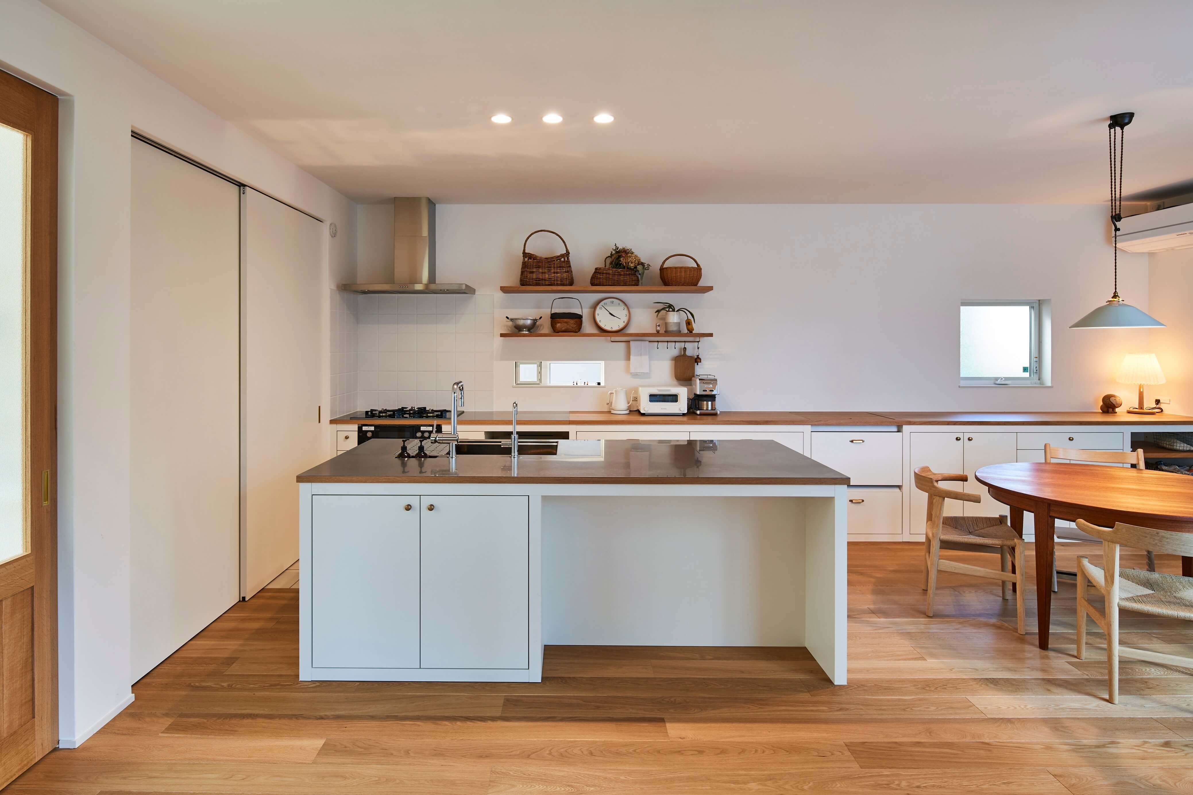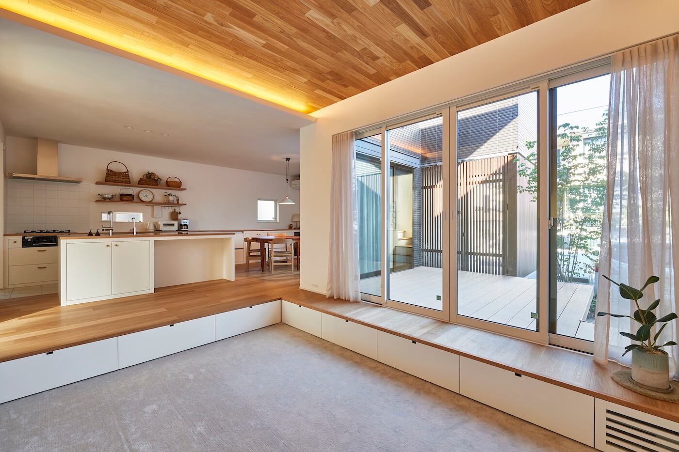 #自然素材 #黒い家 #ピットリビング #書斎コーナー #ウッドデッキ #天井板貼り #造作キッチン #造作家具 #間接照明