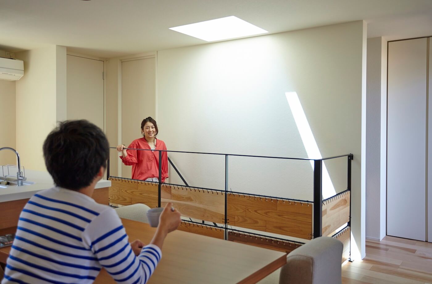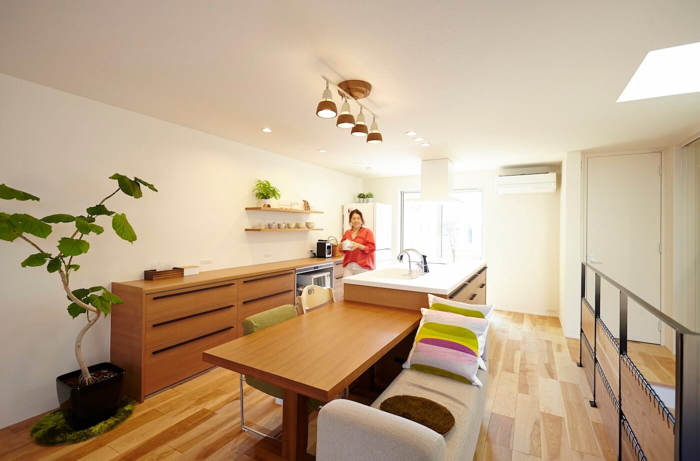 #自然素材 #天窓 #2階リビング #造作階段 #ピットリビング #狭小地 #2階水廻り #間接照明 #天井板貼り