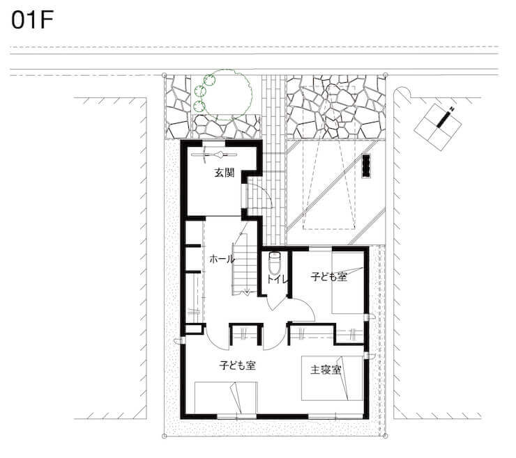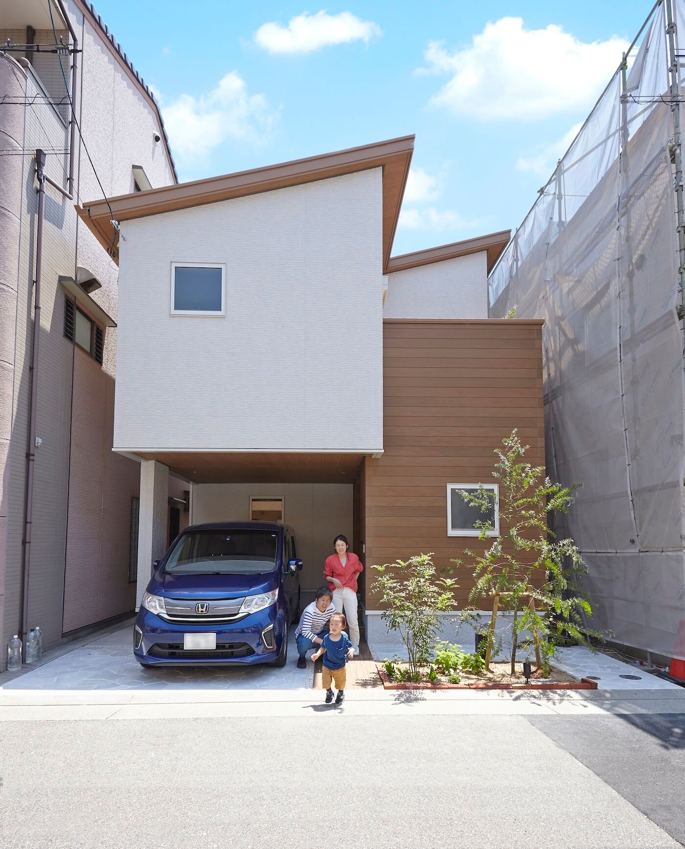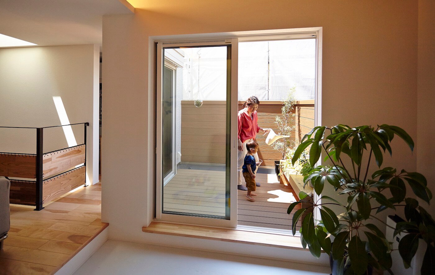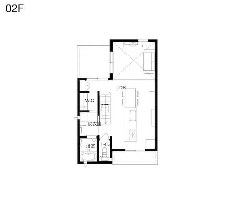 当敷地は狭小地で、周囲には2階建、3階建が立ち並ぶ住宅地の一画。その中でも如何に広く、気持ち良く、周りを気にせず生活できるかを意識しました。LDKは2階に配置し、3階建が建つ東側は閉じ、安定した採光が確保できる道路側(北側)にリビングを配置。ハイウォールバルコニーによって囲った2階庭を並列に並べることで、広く気持ち良い空間を確保しています。また、暗くなりがちな玄関には、2階の天窓からストリップ階段を介して光が落ちるように計画し、1日を通して明るい玄関となるよう計画しました。26坪の狭小地に建つ26坪の小さな家であるが、それらを感じさせないような明るく開放的な空間をめざしました。