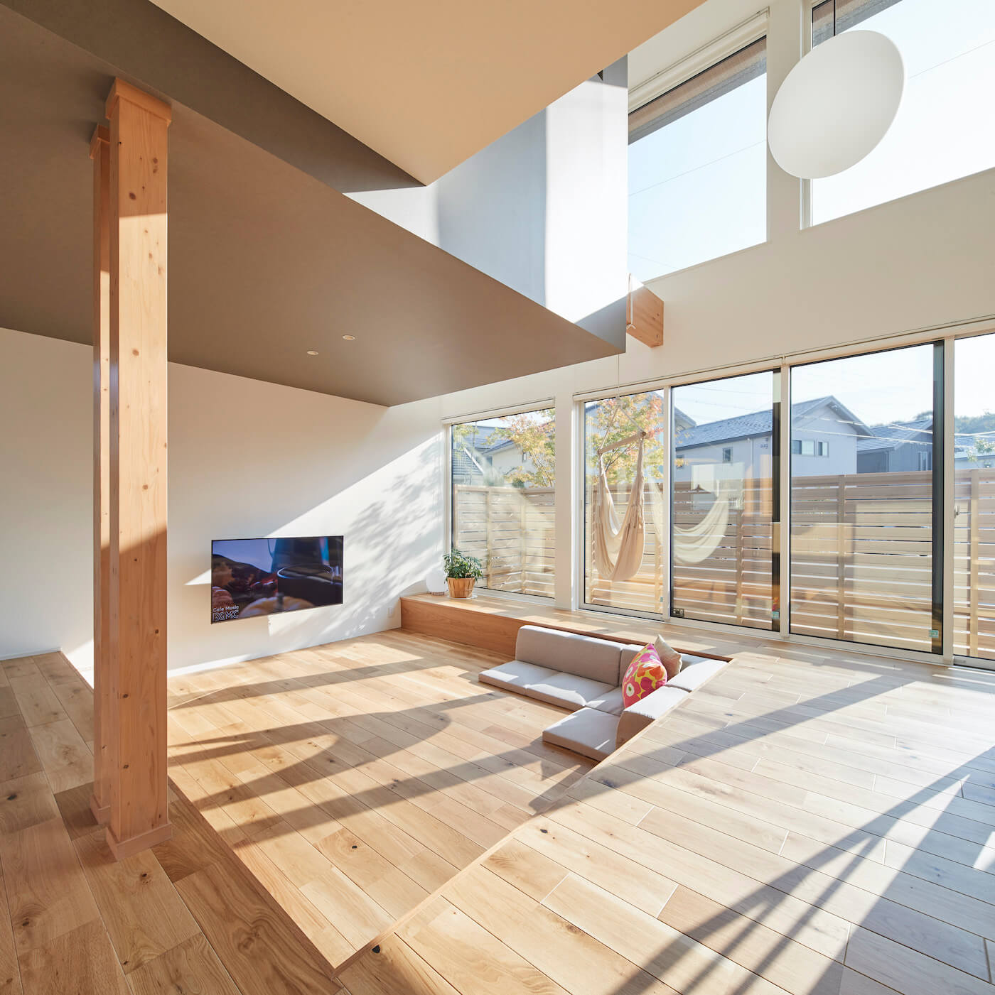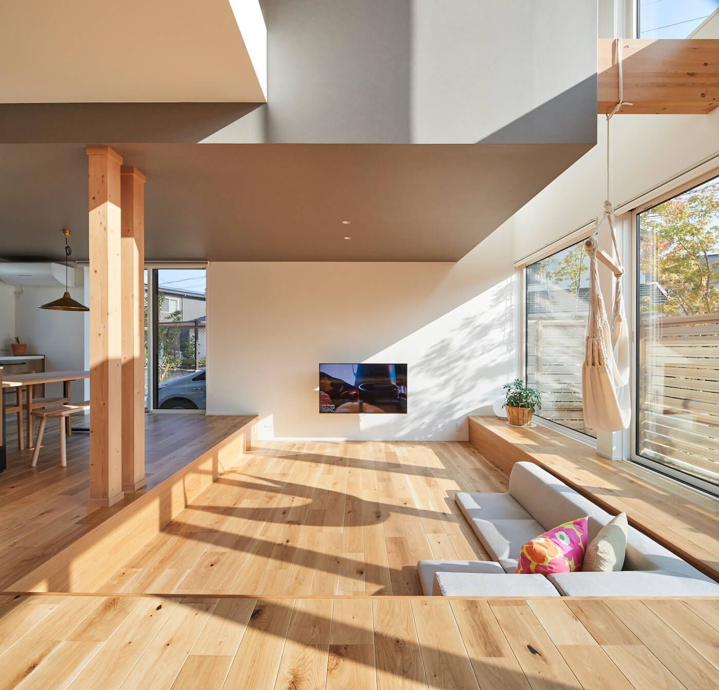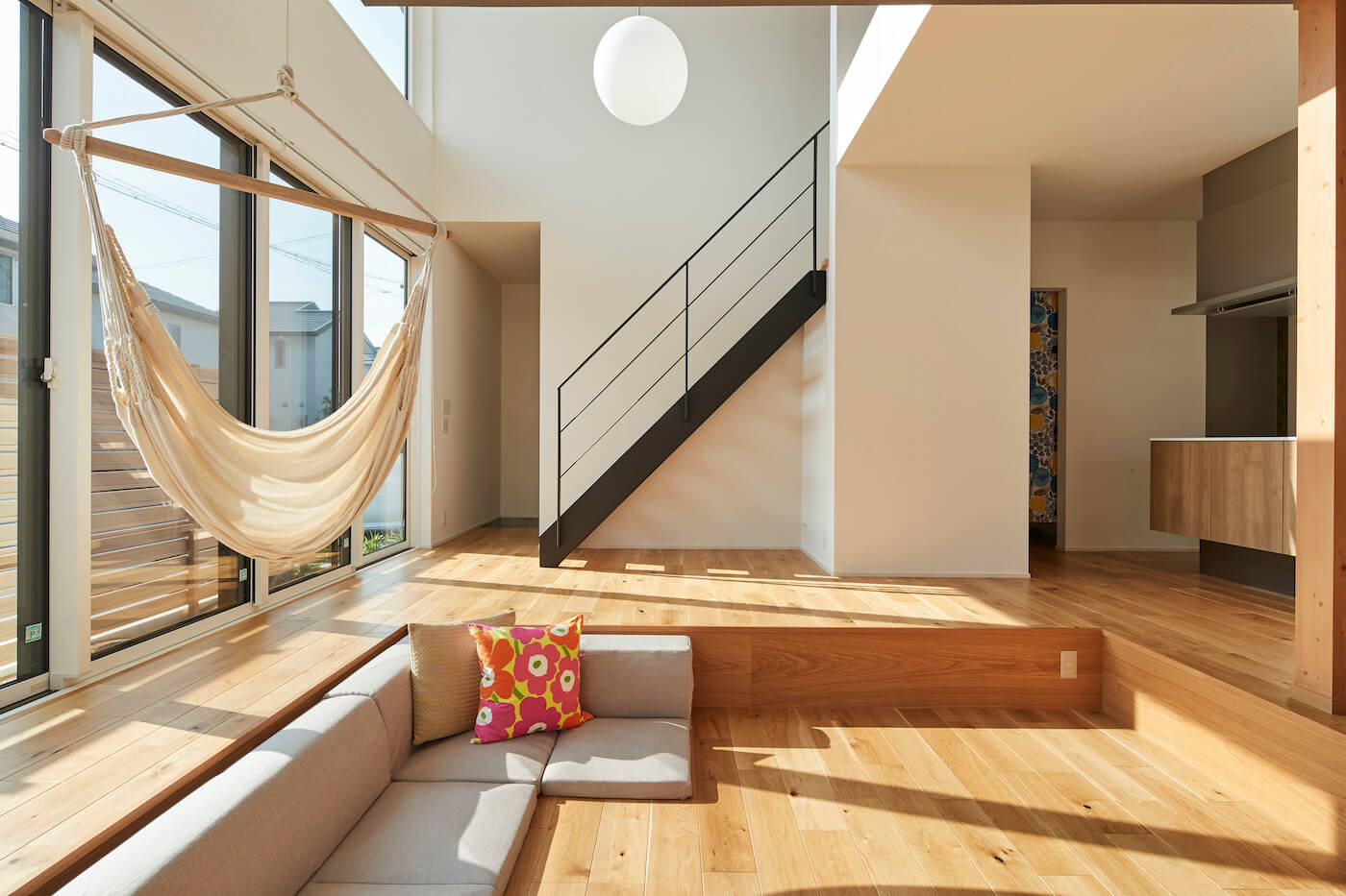 #吹き抜け #ピットリビング #居心地リビング #シースルー階段 #トモイエ #ハンモック #イドコロ #小さい家 #デスクスペース #2階水廻り #連窓 #四角い家 #モディファイ