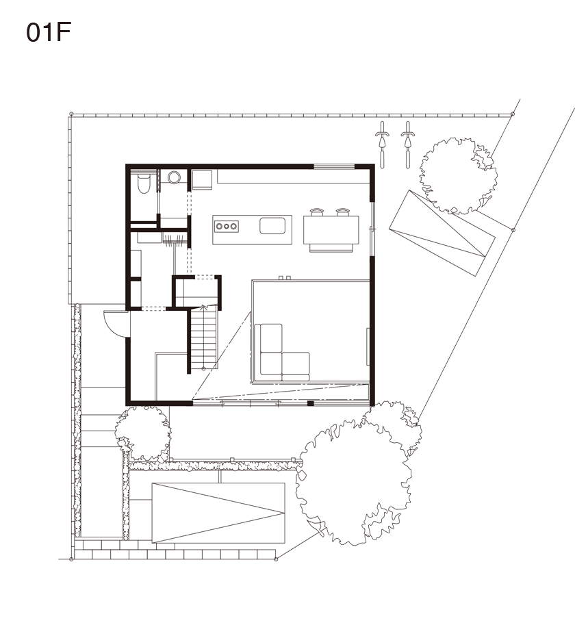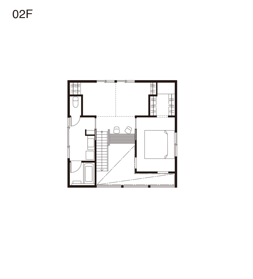 「小さく豊かに暮らす」当社分譲地の一画で計画した若い夫婦のための住宅です。家族の居場所を吹き抜けを介して緩やかにつなげていくことで、小さくても豊かで憂いのある生活ができるように構成しました。「黒い箱の中に浮かぶ黒い箱」 7.5×8で構成した四角い黒い箱の中には黒い箱を浮かせています。この箱を中心に各居場所を絡み合わせることで、居場所同士に緩やかなつながりをもたせています