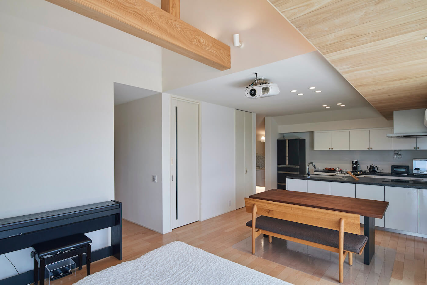 #2世帯住宅 #2階リビング #挽板フロア #オーク材 #吹き抜け #勾配天井 #板貼り天井 #間接照明 #大開口サッシ #フルフラットバルコニー #眺望 #モザイクタイル #プロジェクター #大開口