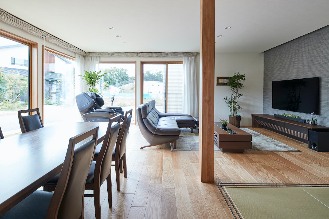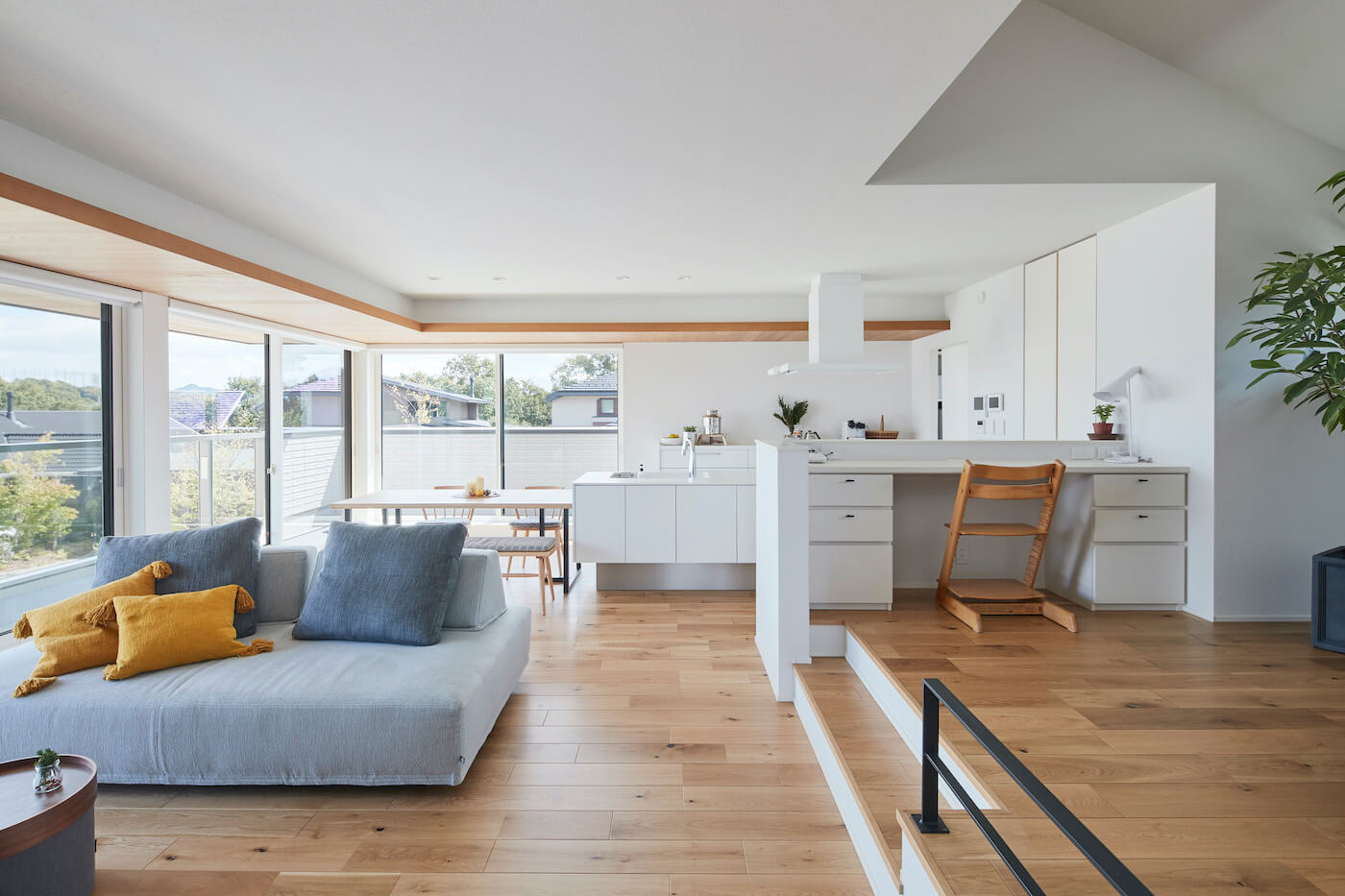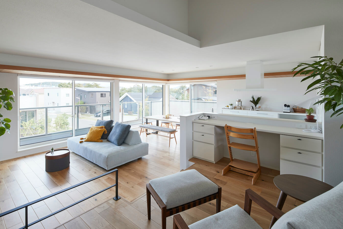 当敷地は当社分譲地で、閑静な住宅街の一画に位置します。1階が親世帯・2階が子世帯の2世帯住宅ですが、それぞれ大開口・連窓を配置し、明るく開放的な空間となるよう計画しました。また、外装に於いては、ビルトインガレージ部に石貼を採用し、アプローチ周りには植栽を豊かに配置して、自然に囲まれた分譲地に相応しい計画となるよう意識しました。