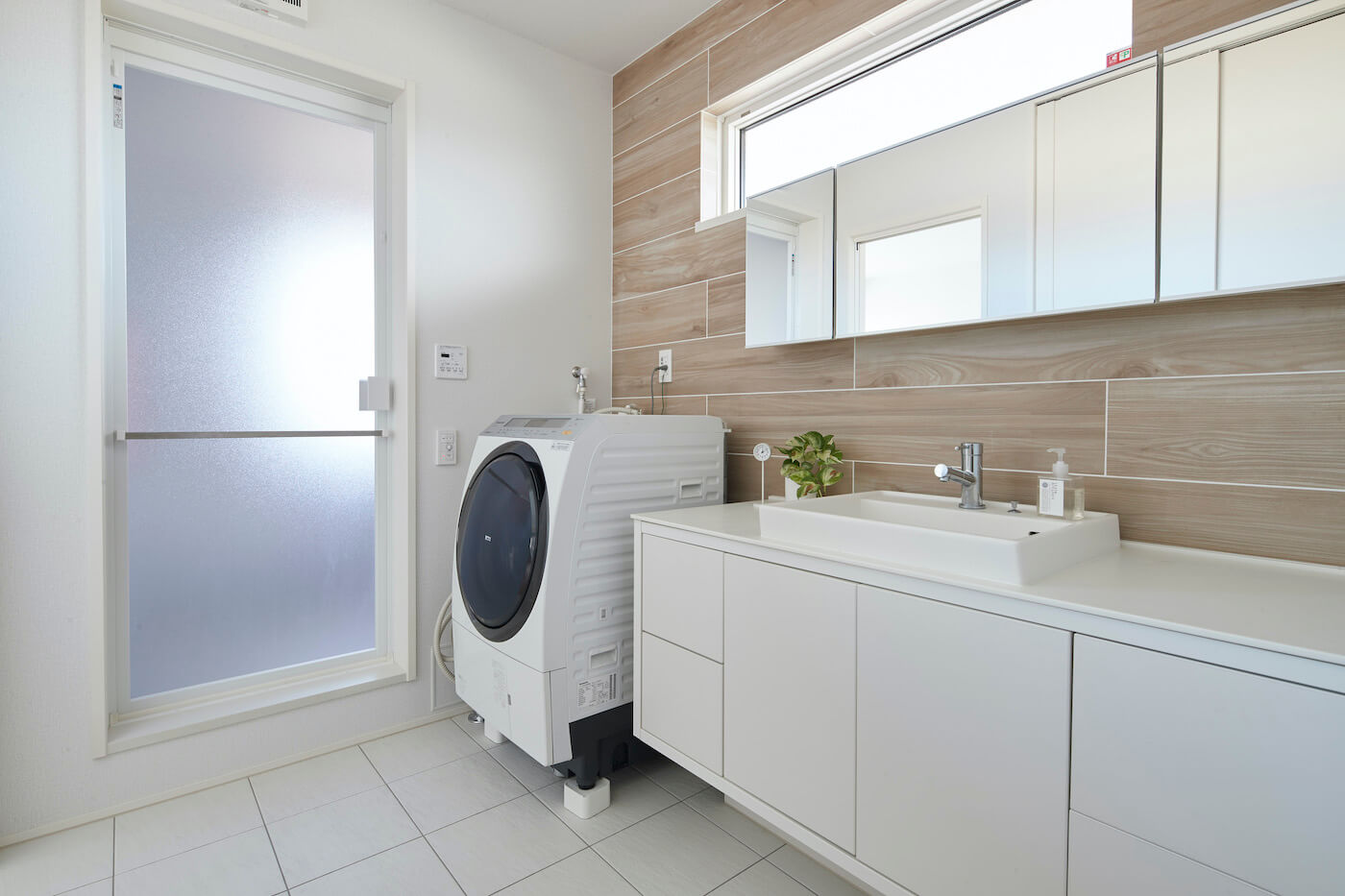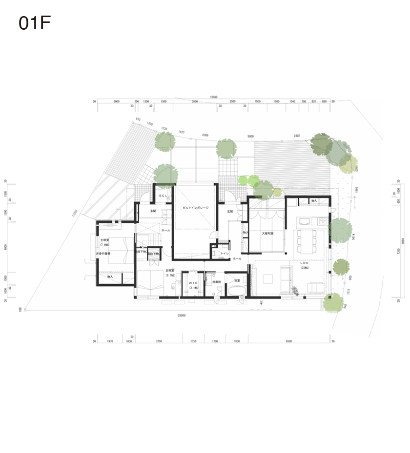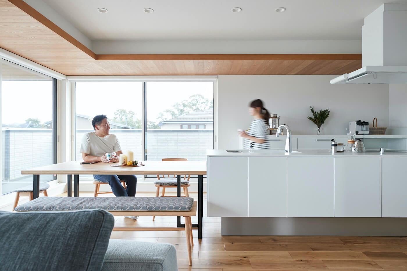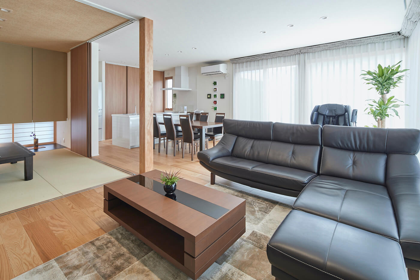 当敷地は当社分譲地で、閑静な住宅街の一画に位置します。1階が親世帯・2階が子世帯の2世帯住宅ですが、それぞれ大開口・連窓を配置し、明るく開放的な空間となるよう計画しました。また、外装に於いては、ビルトインガレージ部に石貼を採用し、アプローチ周りには植栽を豊かに配置して、自然に囲まれた分譲地に相応しい計画となるよう意識しました。