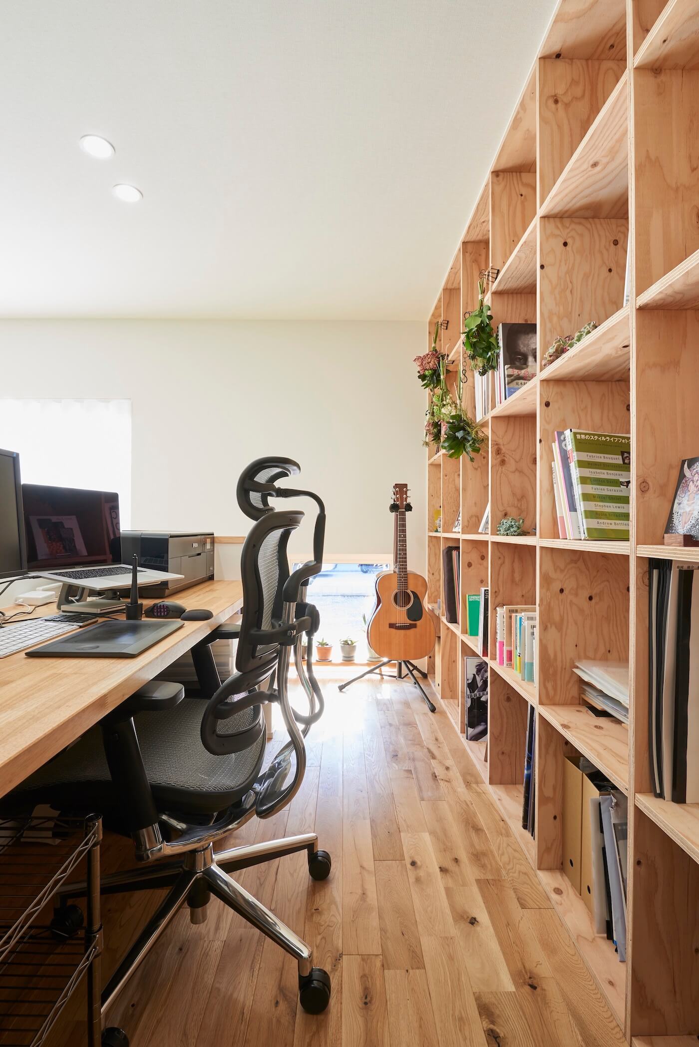 #畳リビング #仕事コーナー #書斎コーナー #本棚 #ウッドデッキ #無垢床 #2階水廻り #室内干し #築山