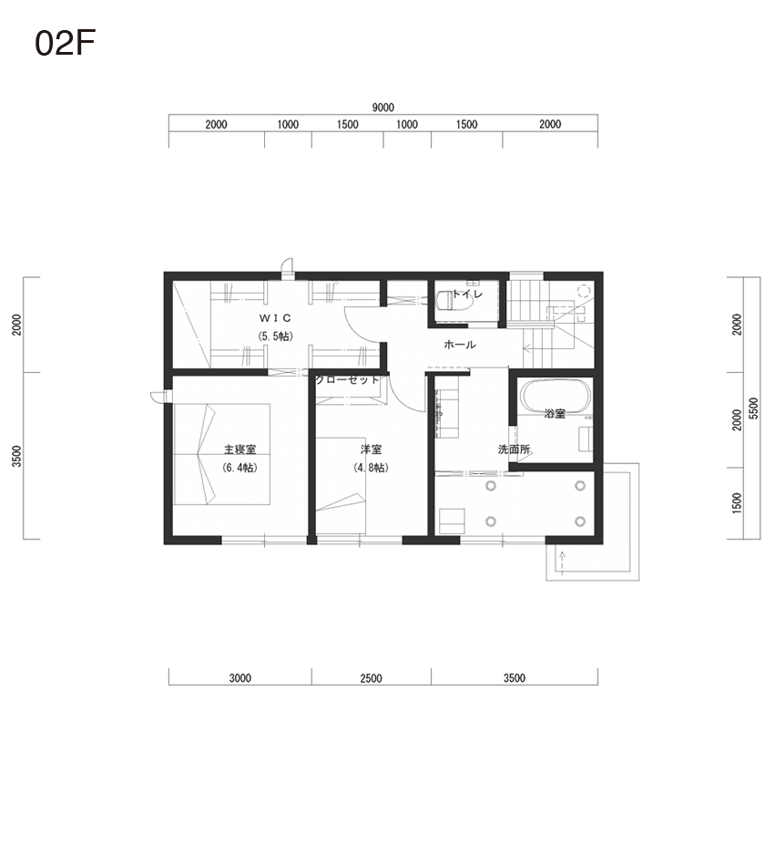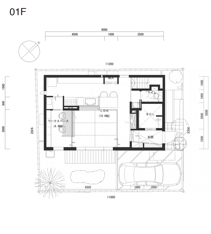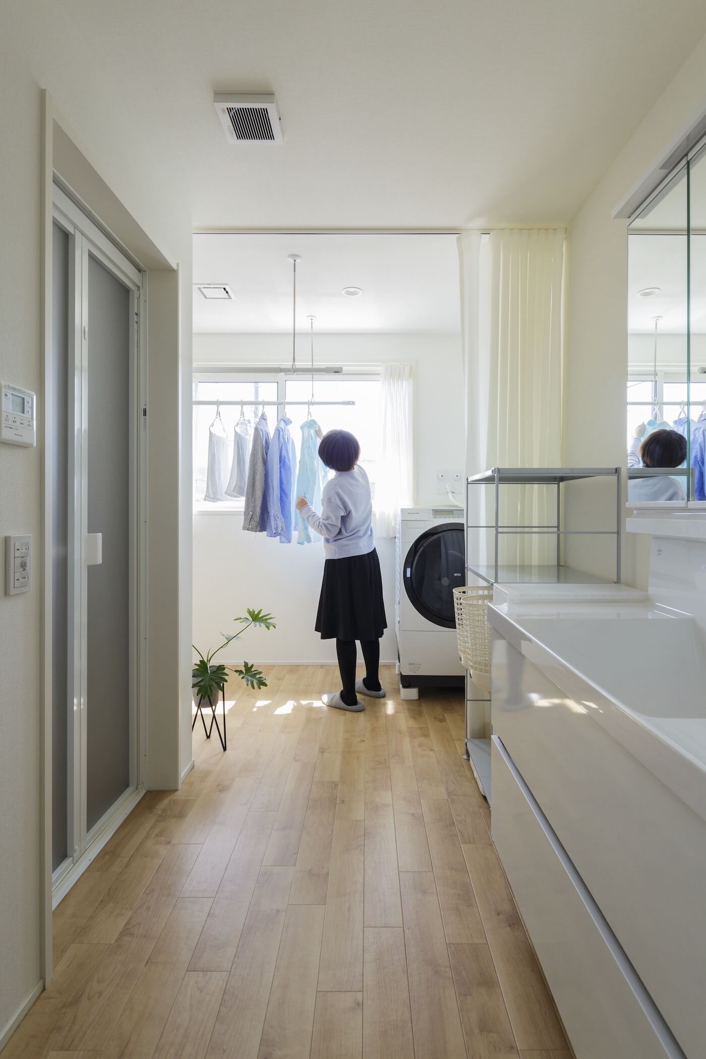 当敷地は当社分譲地で、閑静な住宅街の一画に位置します。1階のリビングは小上がりの畳スペースとし、そこを囲うようにキッチン・ダイニング・仕事コーナーを配置しました。それにより、御家族はどの居場所にいても、繋がりを持つ事が出来ます。また、2階水廻りを採用し、洗面室と繋がった室内干しスペースを確保し、共働きの御夫婦にとって家事が極力負担にならないよう計画しました。