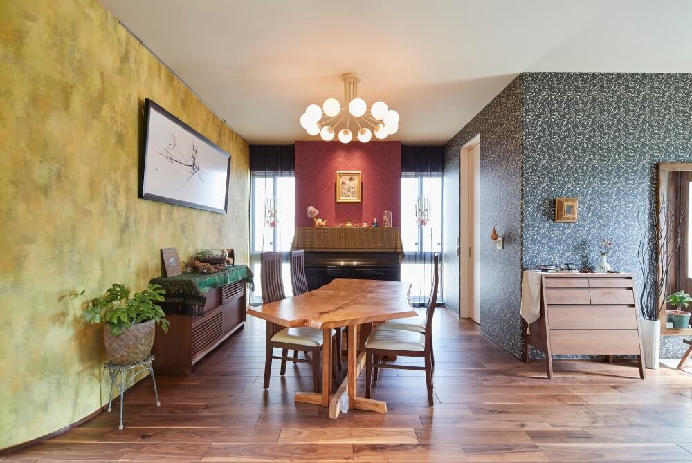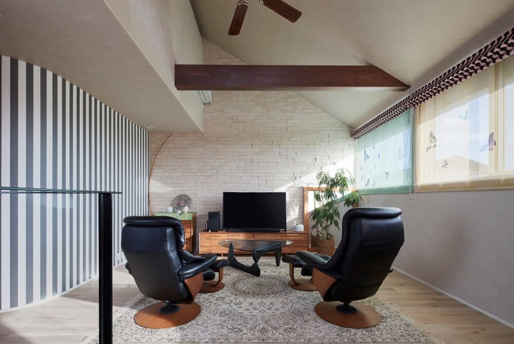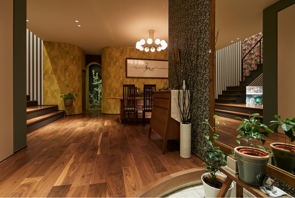 #ステージリビング #リビング階段 #吹き抜け #あらわし梁 #タイル壁 #壁紙 #風水 #ラグジュアリー #ピアノ #曲線 #ビンテージ #ラスティックウォールナット