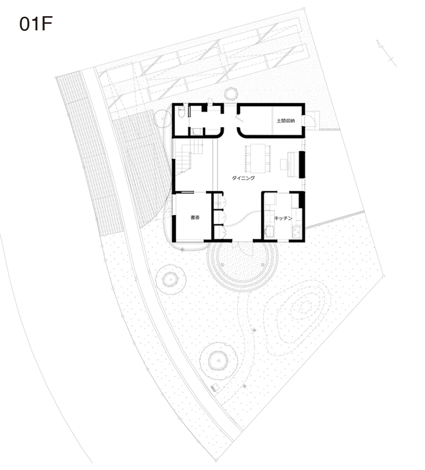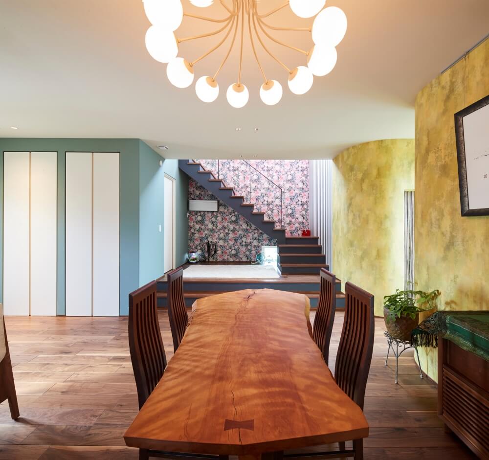 自営業でお忙しいご夫婦のための住宅です。敷地は当社分譲地の一画で緑豊かで閑静な住宅地です。曲面が大好きなご主人と映画「アメリ」に登場するシーンのような幻想的で非現実的な空間を好まれる奥様が部材選定からそのディテールに至るまでこだわり抜いてこの家が生まれました。部屋を仕切る建具はできる限り使わず、1階のダイニングと2階のリビング、寝室を吹き抜けや局面の壁で緩やかにつなぐことで一体感を持たせています。