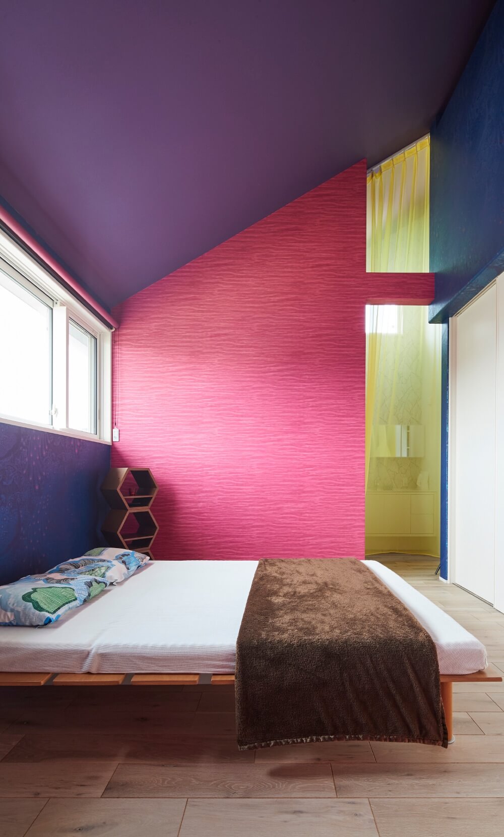 曲面の壁、光の三原色を用いた壁紙、ウィンドートリートメント、家具、室内に差し込む自然光など空間を構成する全ての要素が五感に働きかけてきます。
