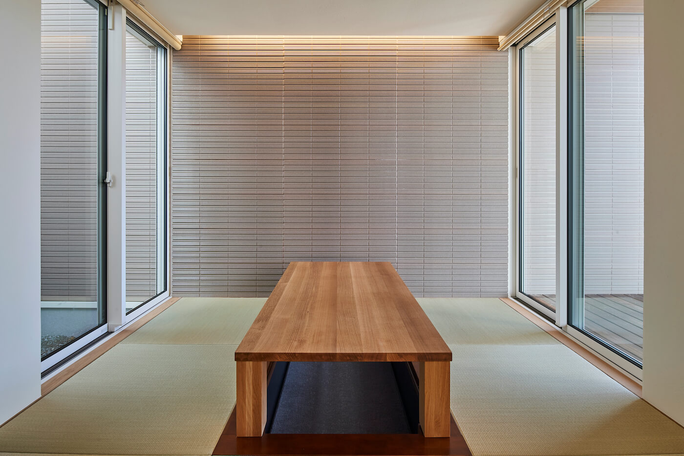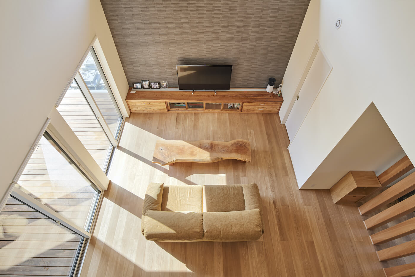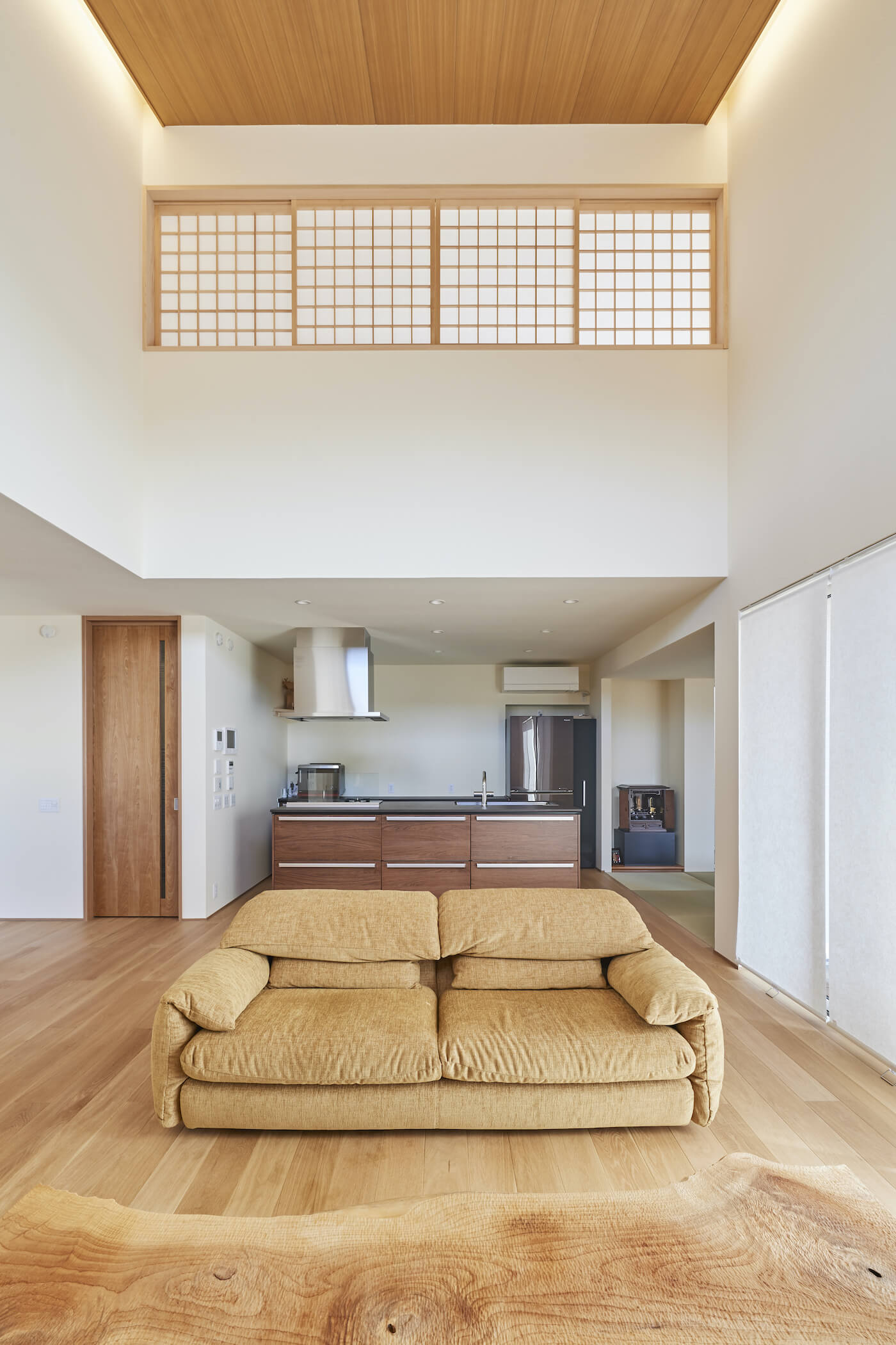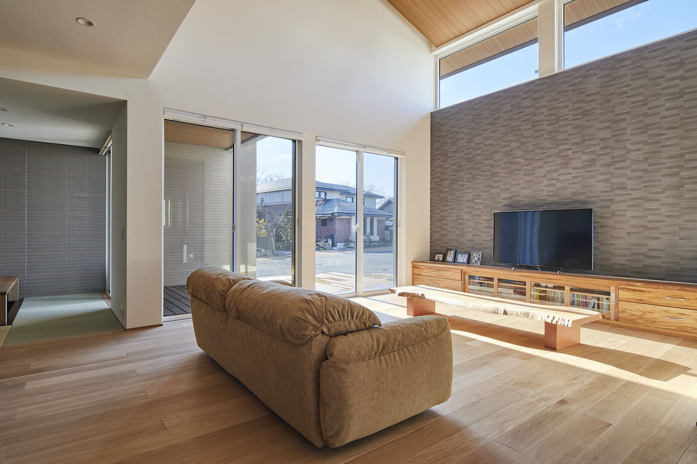 #自然素材 #ウッドデッキ #天井板貼り #間接照明 #吹抜 #オーク #和室 #掘りごたつ #連窓 #坪庭