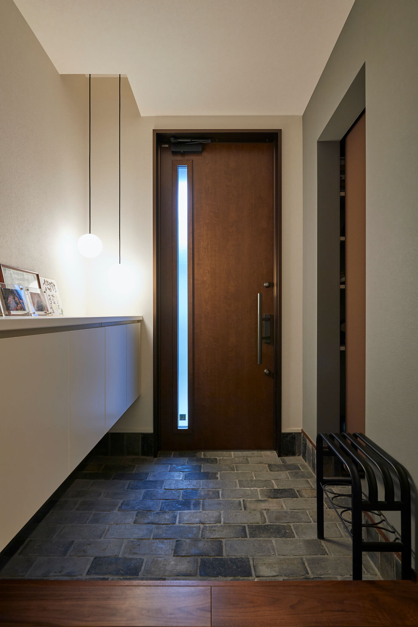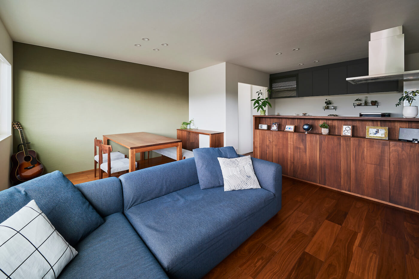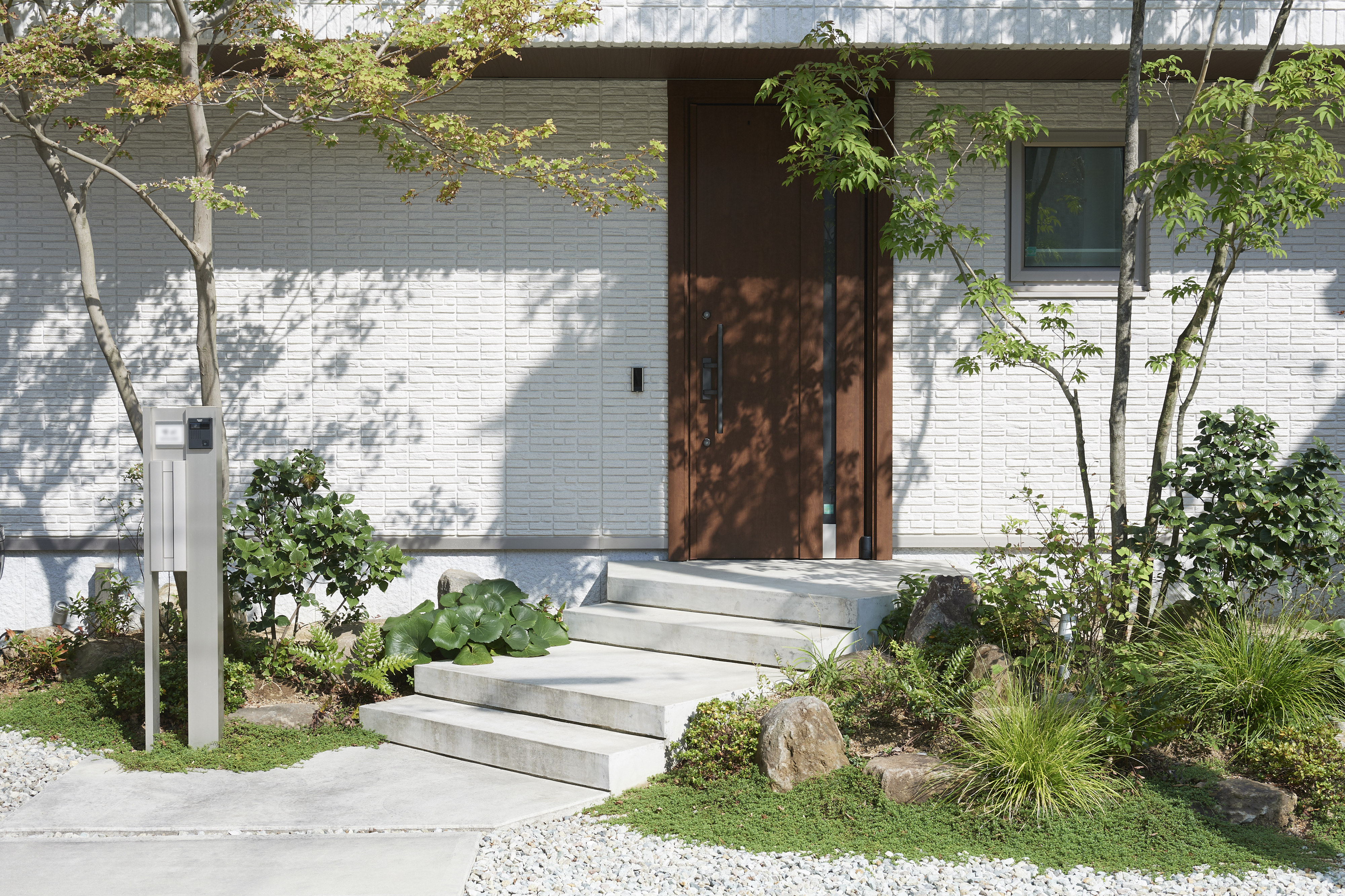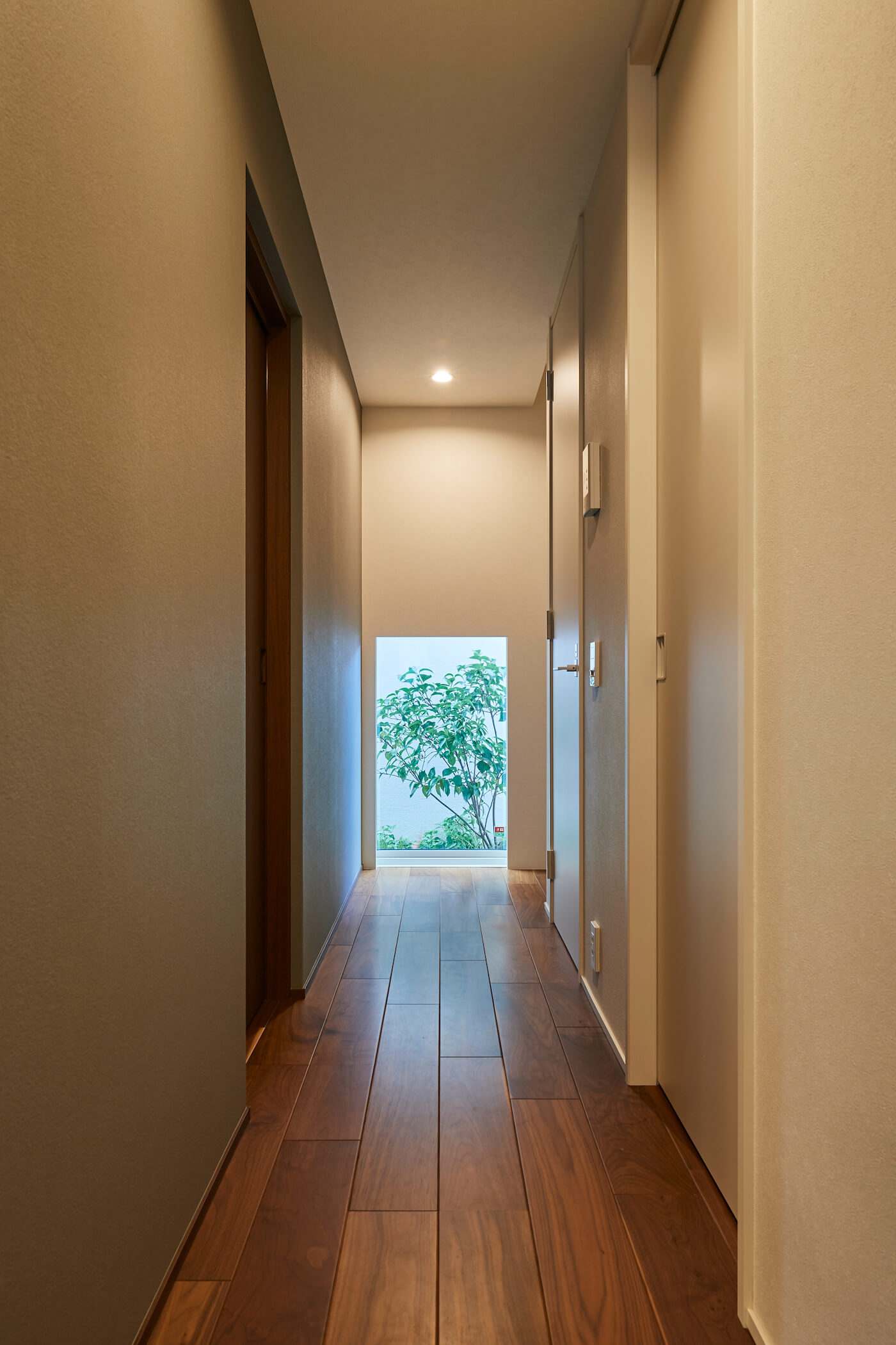 当宅地は高台に位置し、隣家との高低差も4m程有ります。2階レベルからは鉢伏山と大阪湾が望める為、それを軸にプランを計画しました。2階リビングの際はそこに至る迄の動線も重要ですが、玄関に入って、北庭の植栽を見ながら、階段へアクセスし、階段を上りきりLDKに至ると、東側に配置した計6mの大開口で鉢伏山・大阪湾が見えるように計画しました。LDKのどの場所に居ても、気持ちよく景色を見ながら生活出来る計画となっております。