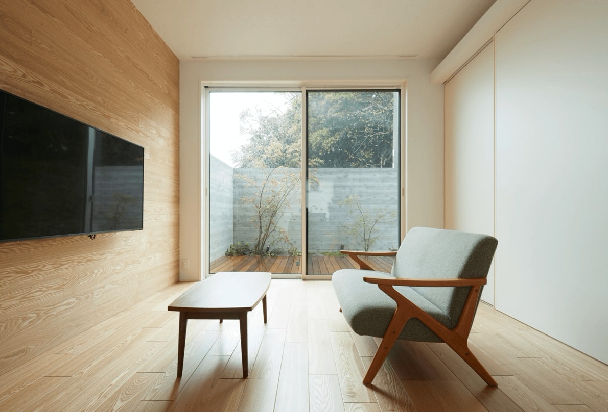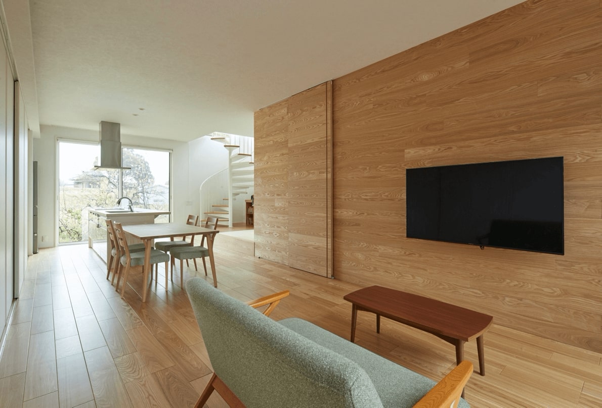 天井の照明もなるべく少なくし、間接照明を採用。また、木造らしさを演出するため、TV設置面の壁に木パネルを採用。建具も目立たないよう同じ材質で仕上げました。