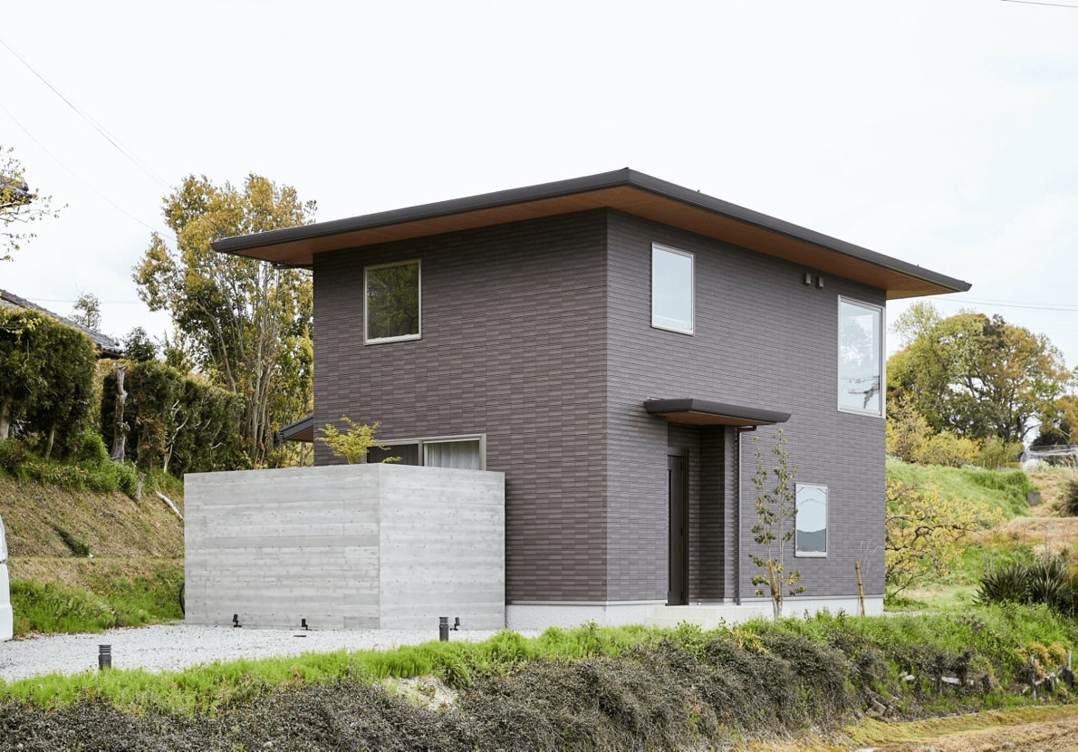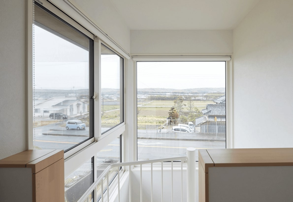 敷地は、道路から南に少し高く、畑→幹線道路→田畑というロケーションが広がっています。東には人が歩けるほどの道路とその奥に竹藪が存在し、西には、北側と同じく田畑が広がっています。南は、建築地よりも少し高くなっており、隣家が存在しているため、南は閉じ、洗濯干しできる裏動線だけに留めています。西側と北側は田畑が広がり、空まで綺麗に見えるため、家の中から見えるよう、窓を設け景色を切り取りました。