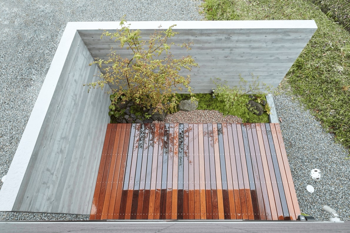 #中庭 #ウッドデッキ #木パネル #収納 #段差のある和室 #コーナー和室 #螺旋階段 #間接照明 #ベルバーン