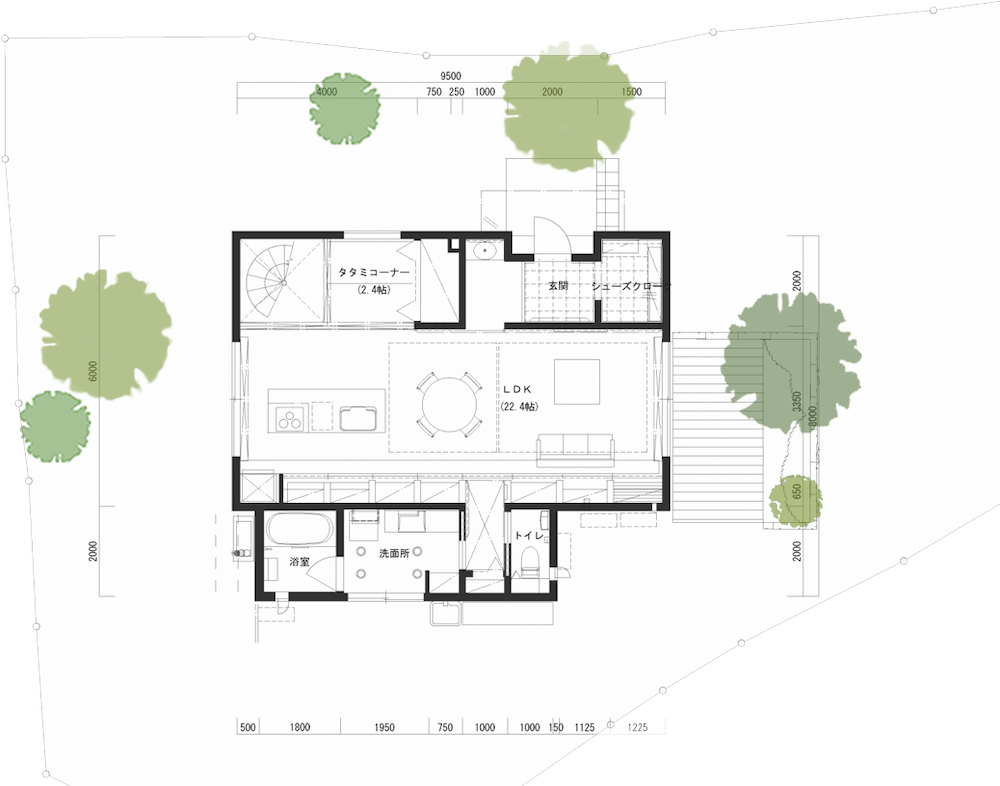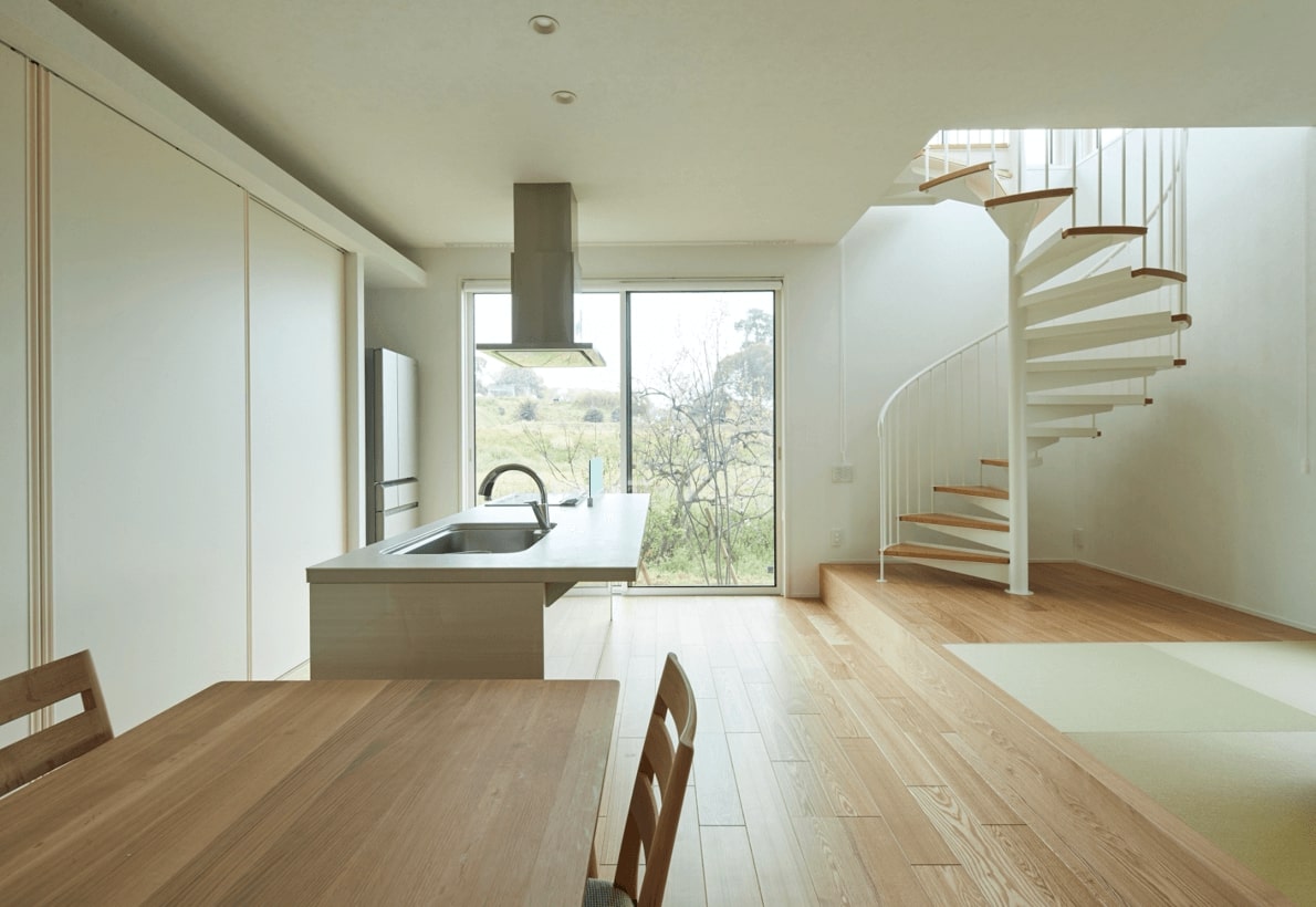 階段は、LDKの広がりを出すため、螺旋階段を採用しています。