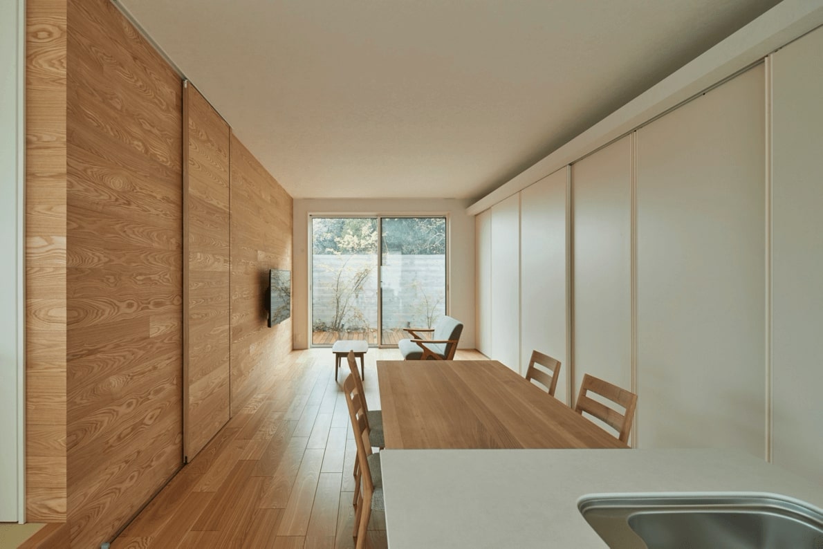 壁面は、白の建具で仕切り、すっきりした空間に。一部は、洗面へと続く、建具となっています。
