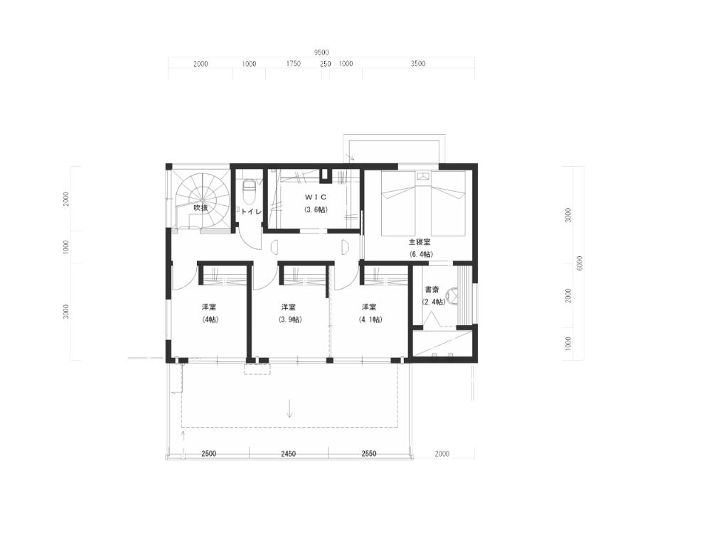 2階はシンプルに主寝室、子供部屋3部屋。2部屋は同性となるため、建具で仕切るだけに。また、螺旋階段の上にはコーナーサッシを採用。朝起きて、気持ちいい景色を見て始まる毎日を提案。