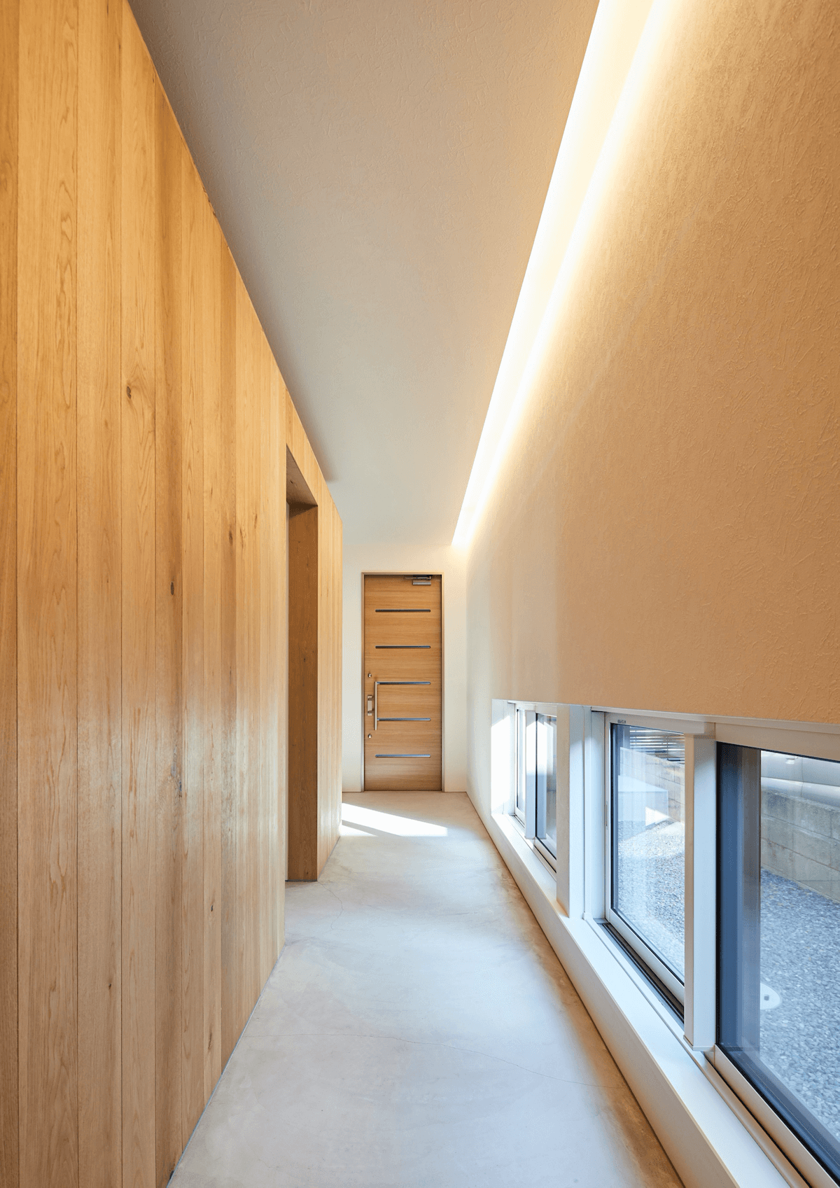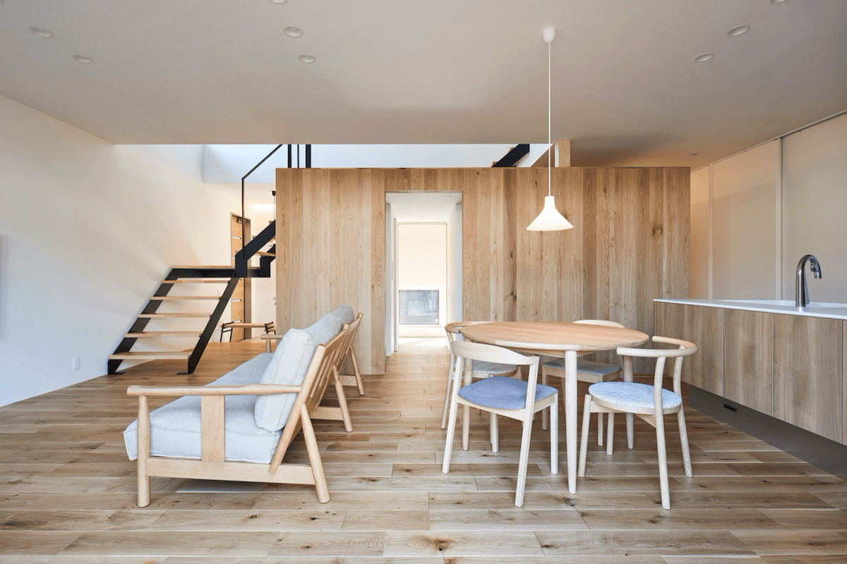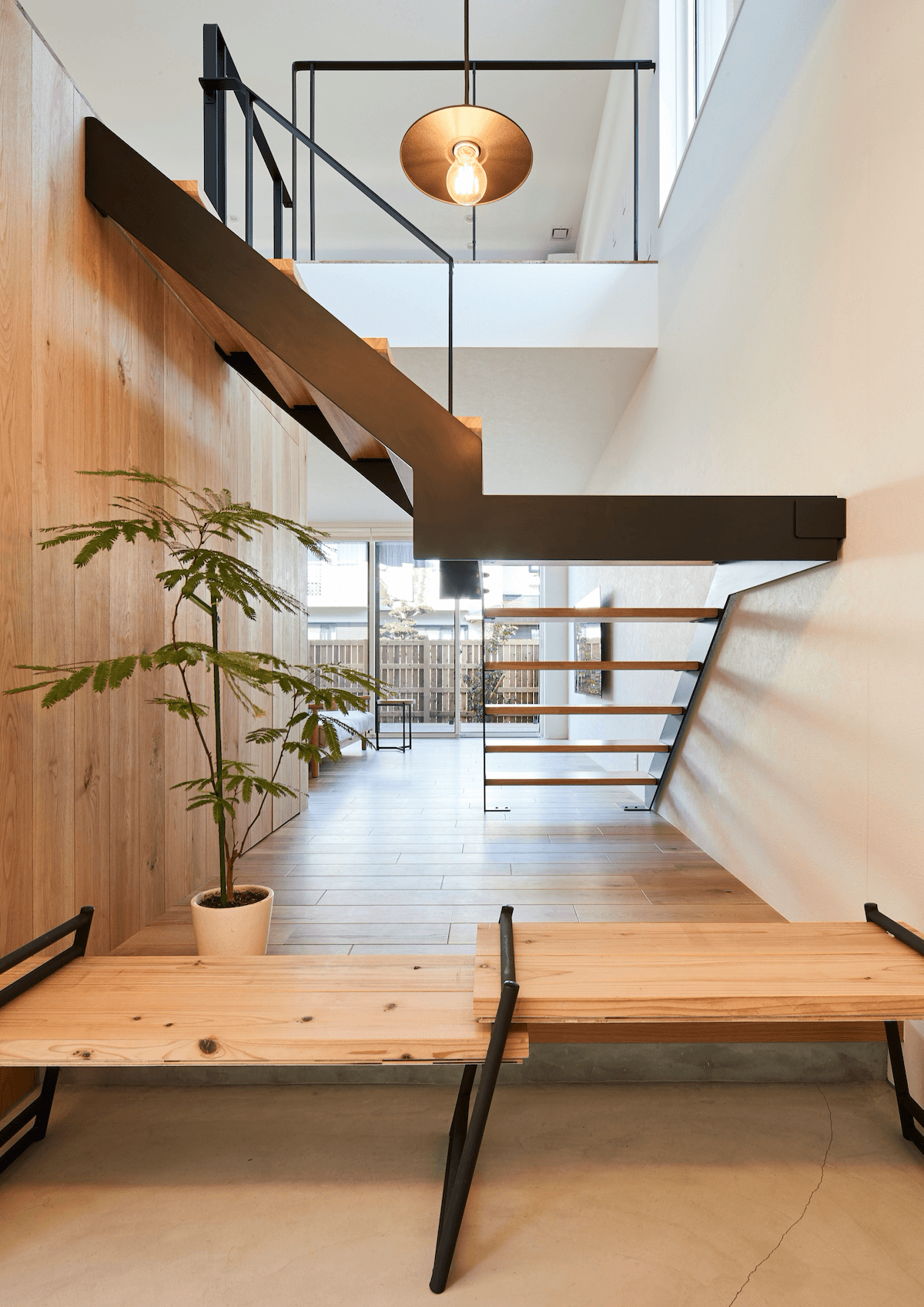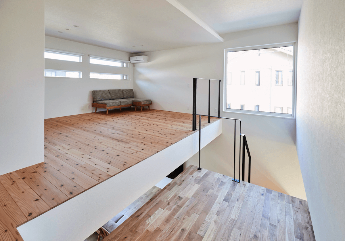 また、歩行者の視線が入ってこないように背の高い目隠しの木塀を作りました。そして木塀が『木箱』に見えるように。部屋内から空の景色だけを切り取る。そして、玄関扉は、道路から見えないように建物で壁をつくり、ポスト、インターホンを配置しました。また、部屋の真ん中に木箱を作りました。玄関から入り、どーんと奥まで続く土間が奥行感を演出し、より広く宇感を体感させてくれます。そのために、一部階段をシースルー階段にしました。そして階段に吹抜けを絡め、光のプラットホームを作る。
