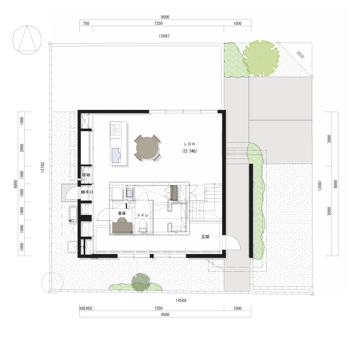 建築地は、北東の角地です。南側は、隣家の車庫、西側には隣家。東側は、道路を挟んで車庫と隣家。北側には道路を挟んで隣家の庭。そして北東には広い空の景色が広がっている。通常、南側にお庭をつくるのがセオリーですがこの敷地は南側にお庭をとっても隣家の視線がぶつかるため、思い切って北東に向けて目線が抜けるように設計しました。