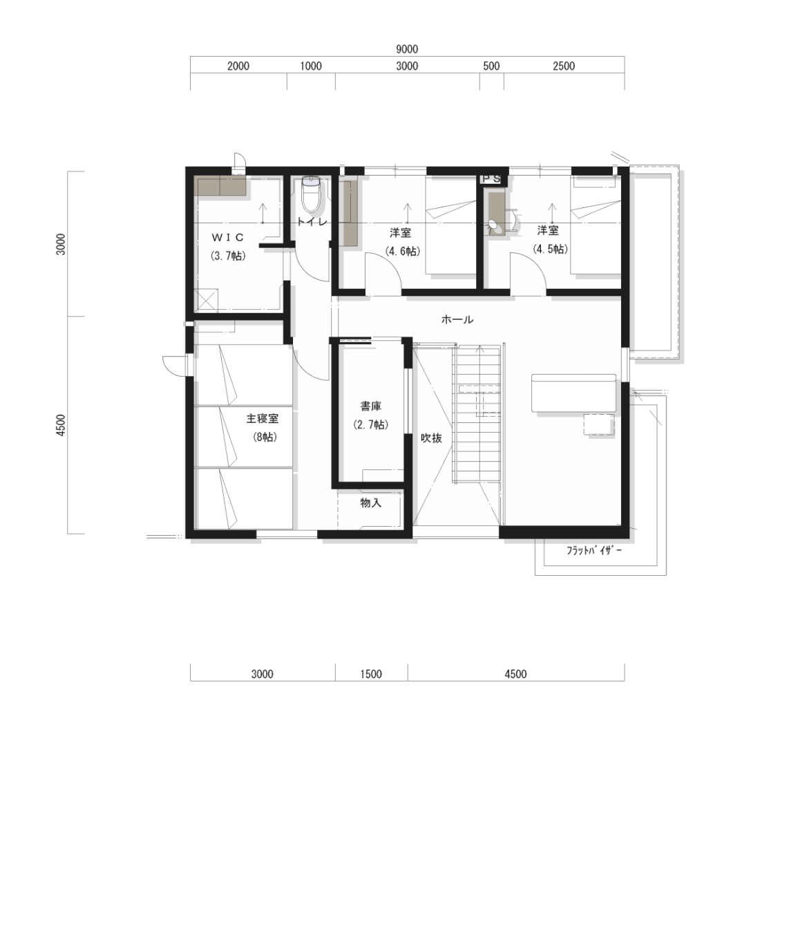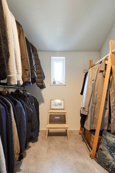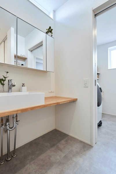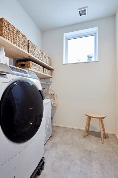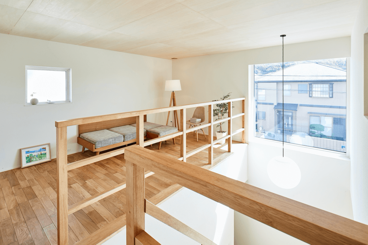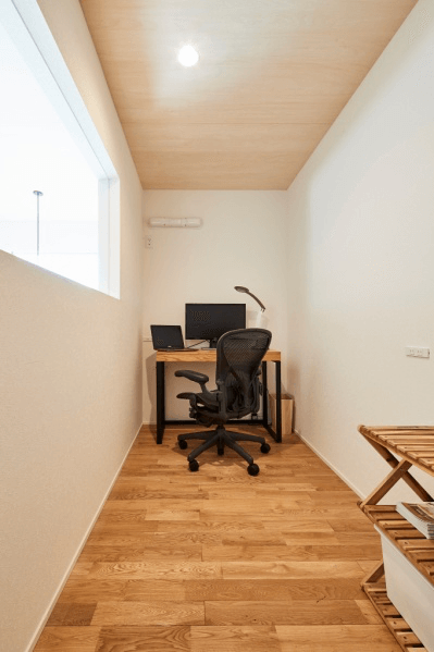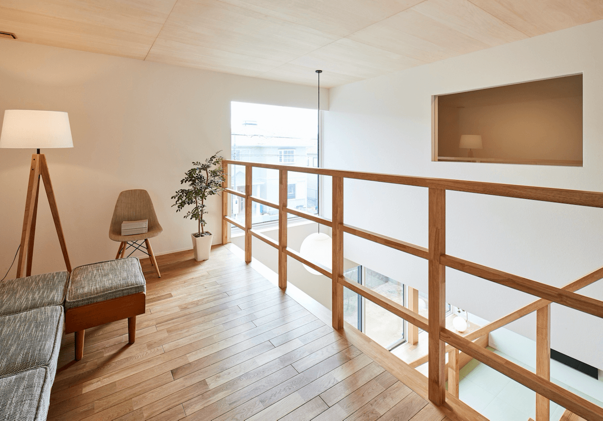 また、段差部分には引出が入るスペースを作りました。引出は結構コストがかかるため、ご主人のDIYで造作されました。プロ顔負けの仕上がりです。そして、驚くなかれ、カップボードも手作りです。その他、収納の棚、パイプ、洗面の三面鏡、WICもDIY!プロの私も仕上がりに驚きました。吹抜けは、シースル階段を絡め、リビングに日が入りすぎないように計画。吹抜けが二階のセカンドリビングをつなぐ役割をしてくれています。そして、吹抜け空間に書斎を併設させ、開口部を設け光の入り口としました。二階の天井面は化粧合板を採用頂き、書斎の天井へと続きます。そして、脱衣室で室内干しをニーズからバルコニーは思い切って無くしました。