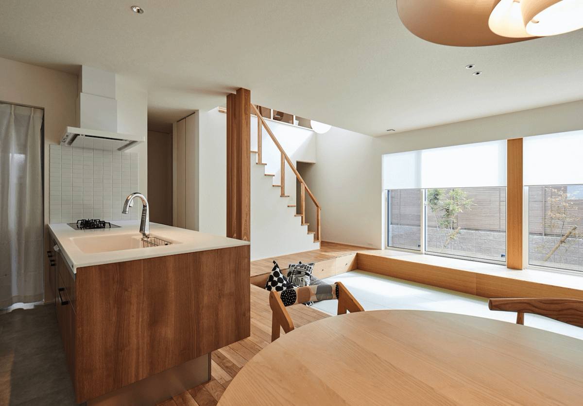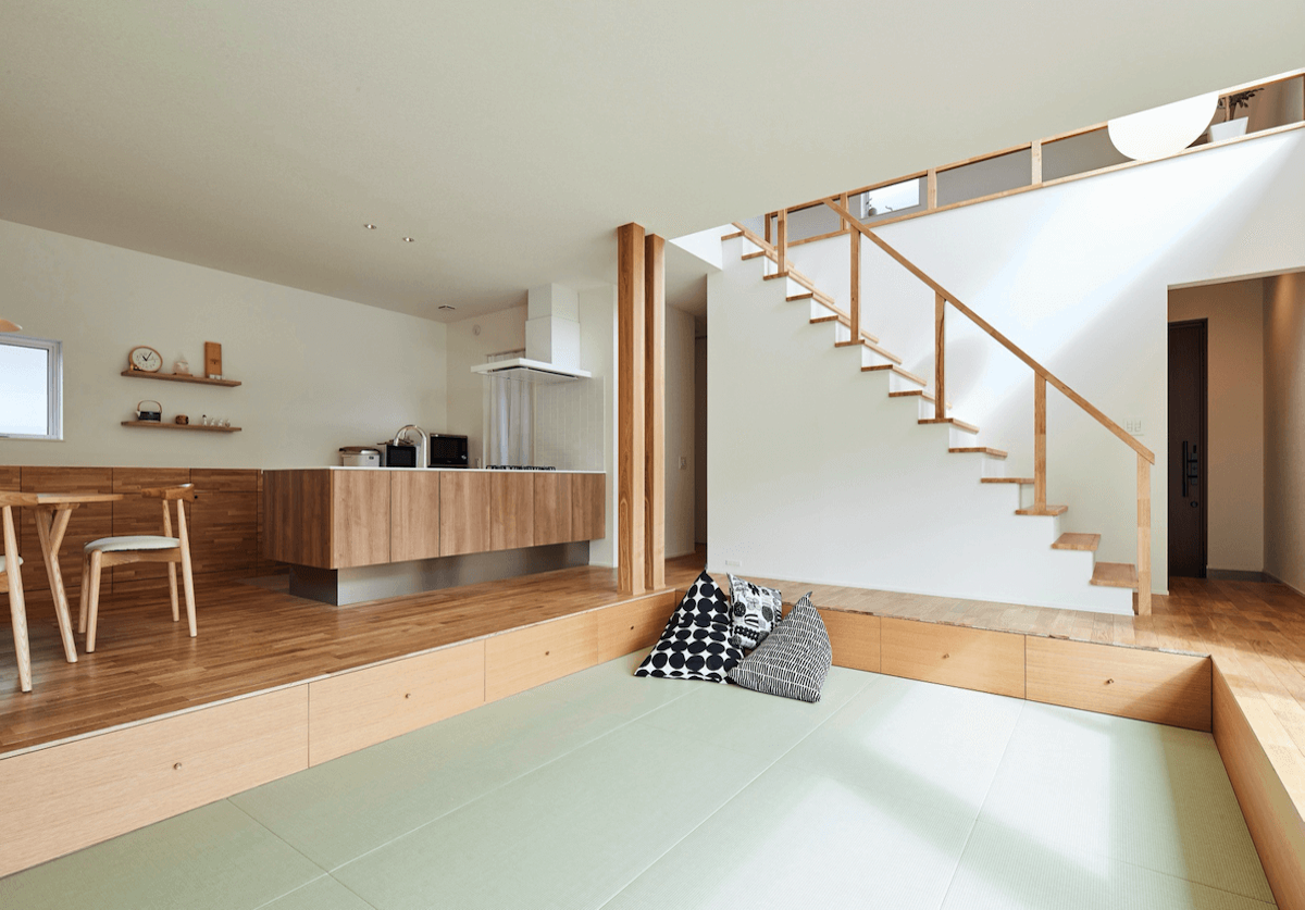 そして、一番のコンセンプトは、段差のあるリビングの床に畳を採用しました→『ピット畳リビング』ソファーにあまり座ることがないというニーズと床にゴロゴロ寝ころんで寛ぎたいという両方をニーズを叶える提案です。