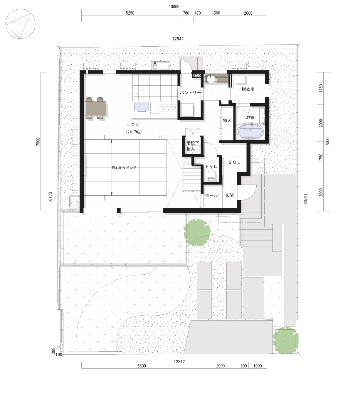 南側が道路に接道し、北・西・東には隣家。開口部は素直に南に開き、ウッドフェンンスで視線をカットするよう計画しました。玄関は、側面からアクセス。正面から見えないように。土留め擁壁もなるべくコストを抑えるため、法面にし前庭を作りました。
