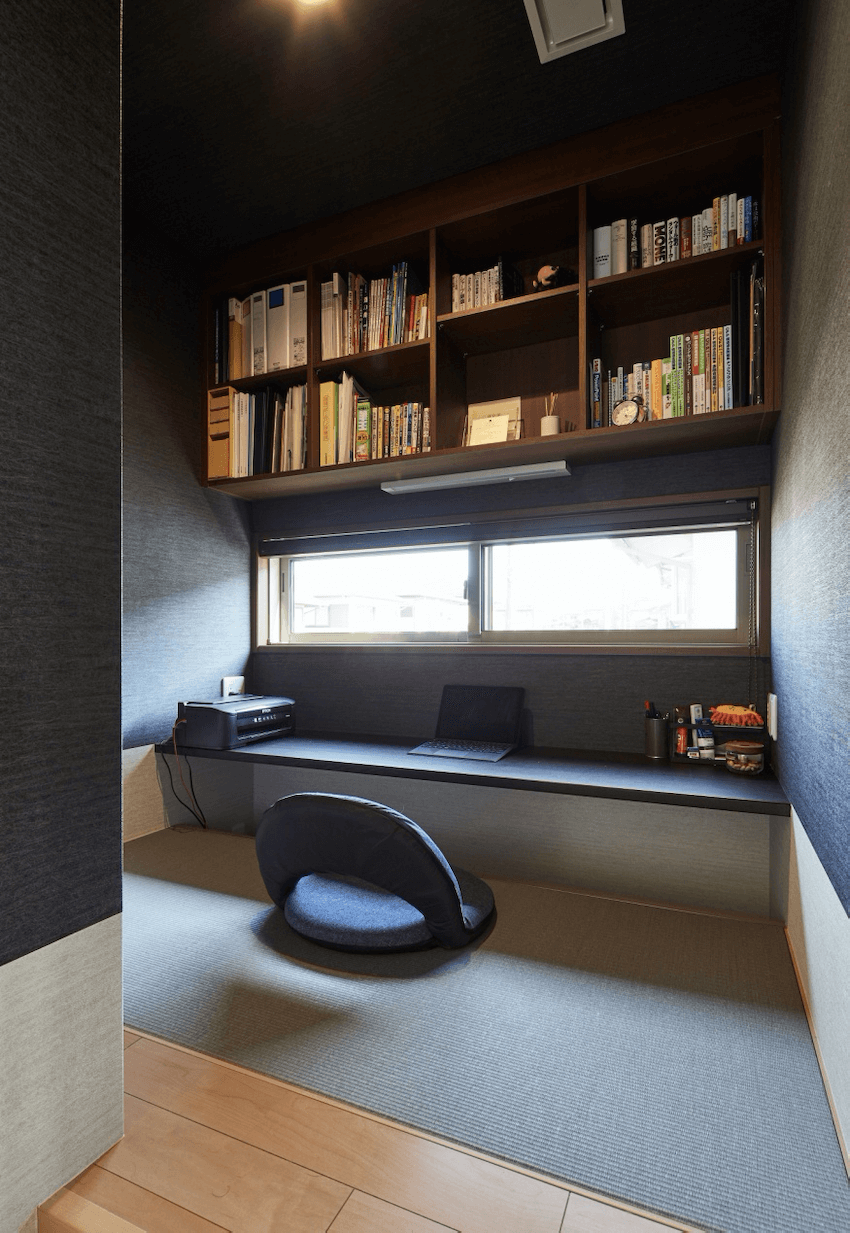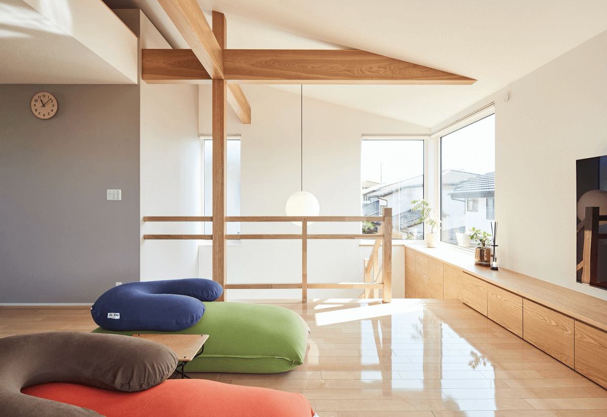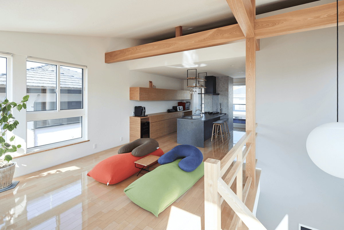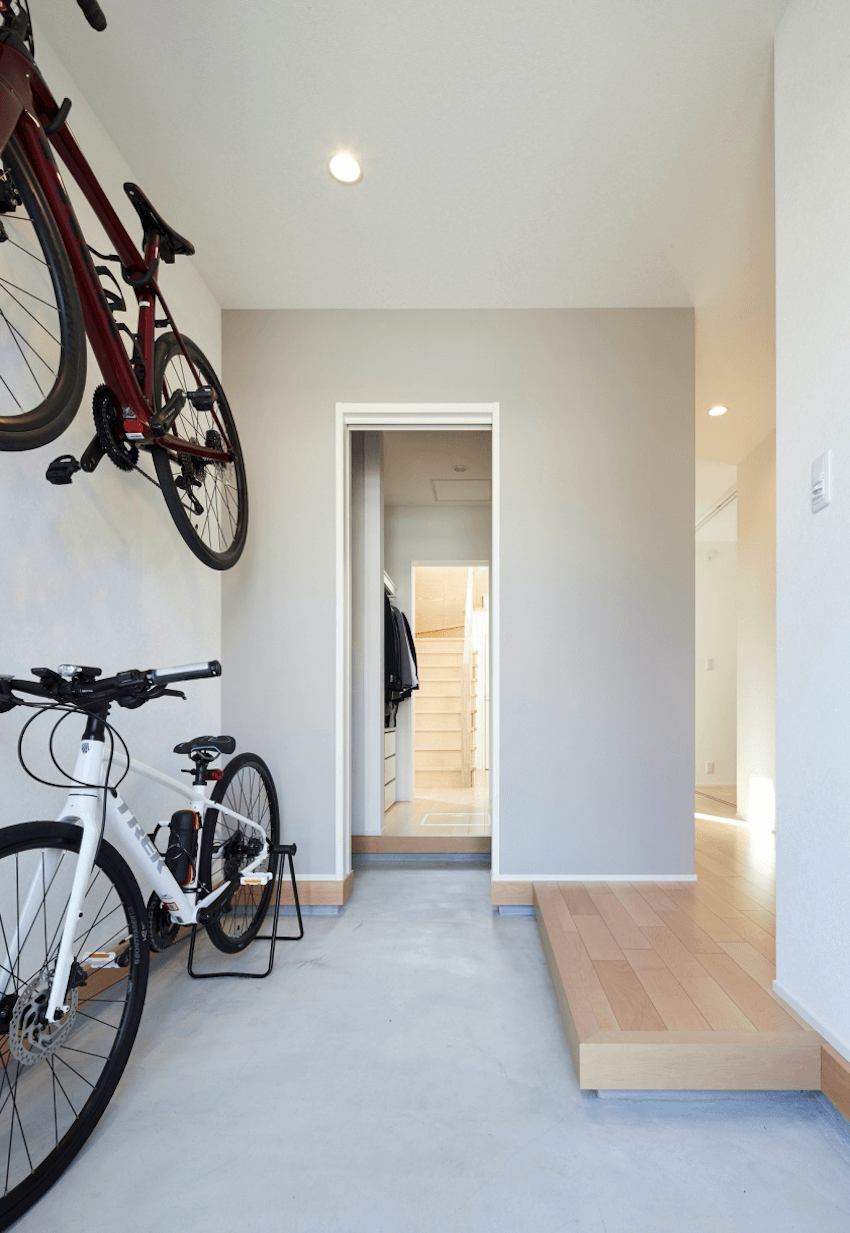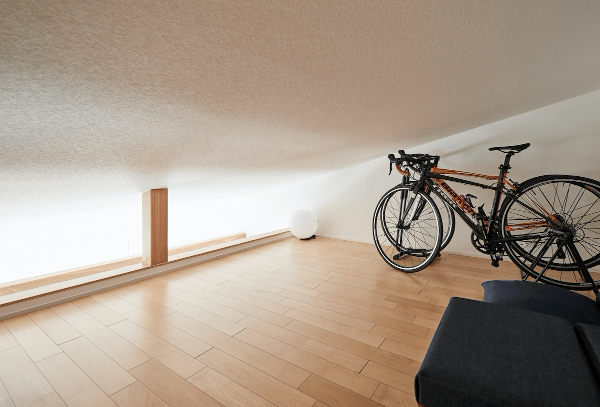 趣味のロードバイクは、玄関とロフトへ。リビングに併設された書斎、ベンチ、キッチン、クッションなど、様々なシチュエーションで楽しめる居場所を沢山作りました。