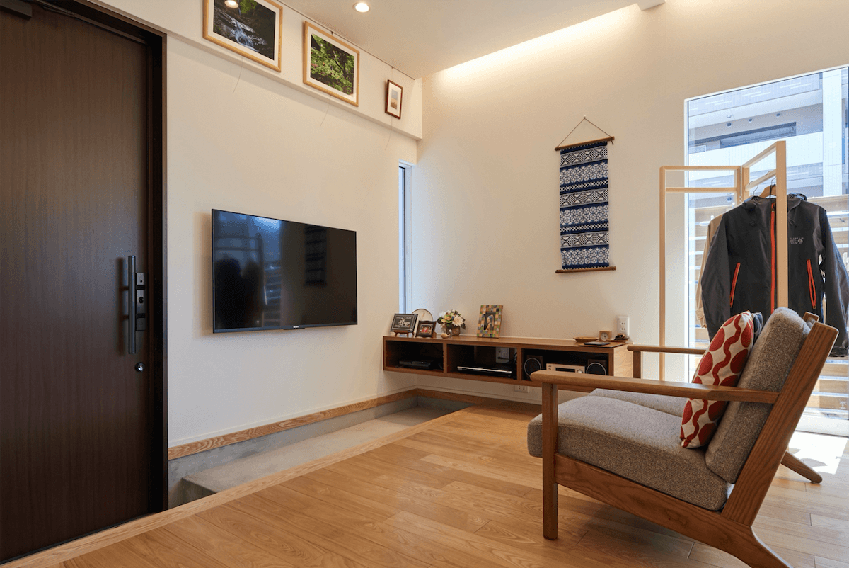 玄関は、土間を2段に分け、1段目は通常の土間として。2段目は素足で歩けるスペースへ。