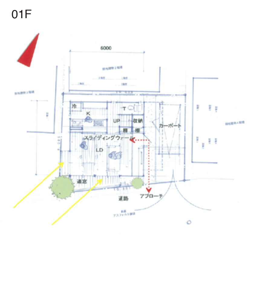 南側には4mの接道とその下に12mの幹線道、西側には2階建アパート、東側には3階建マンション、北側には築古の2階建民家が存在していました。