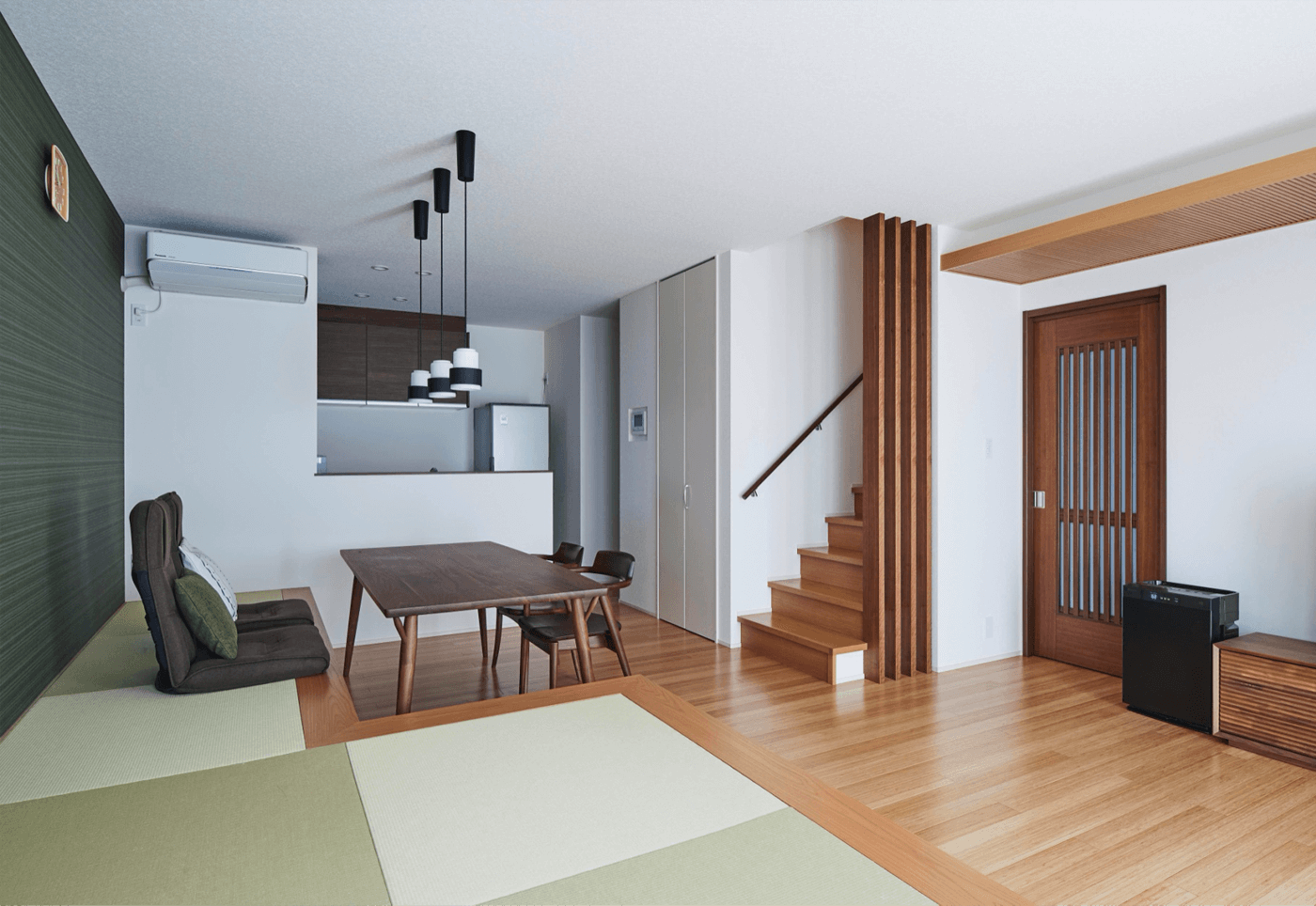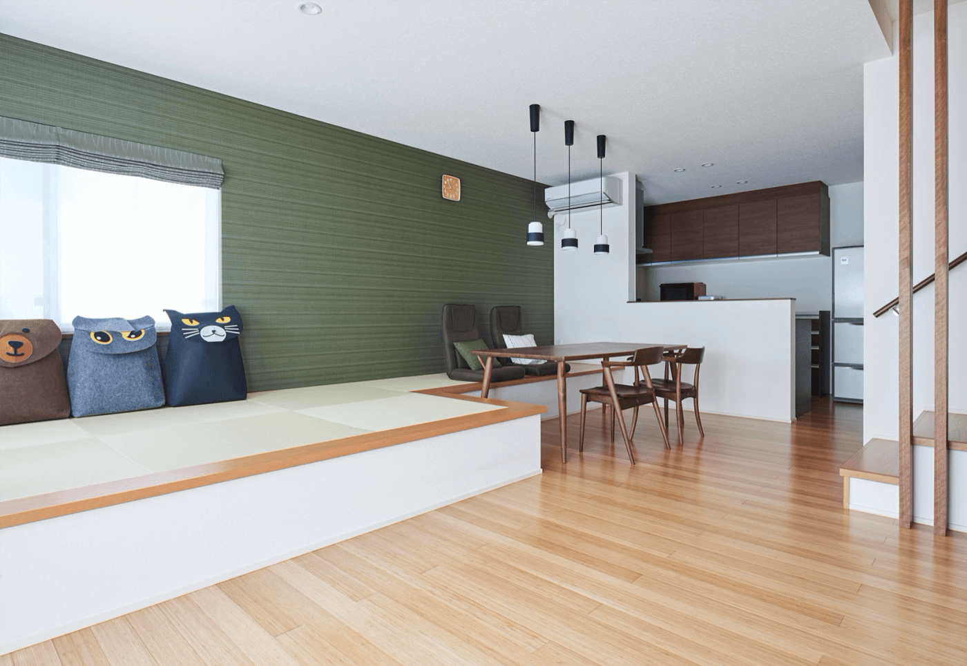 #畳 #畳リビング #畳コーナー #バンブー #無垢床 #間接照明 #和モダン #トモイエ #対面キッチン #リビング階段