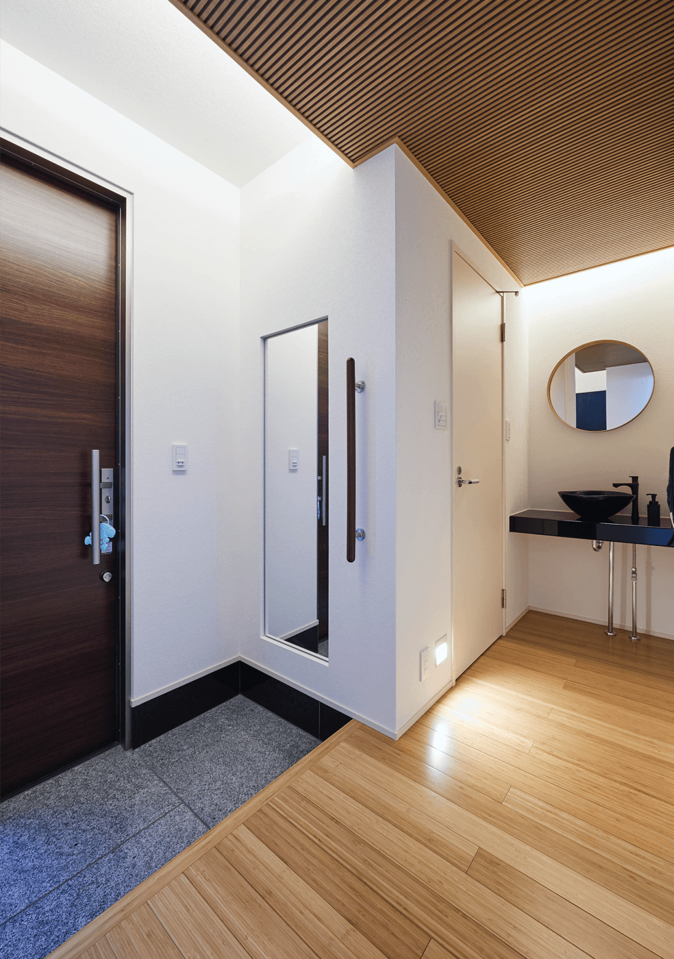 玄関は、一部天井を下げ、リブ木仕上げに。