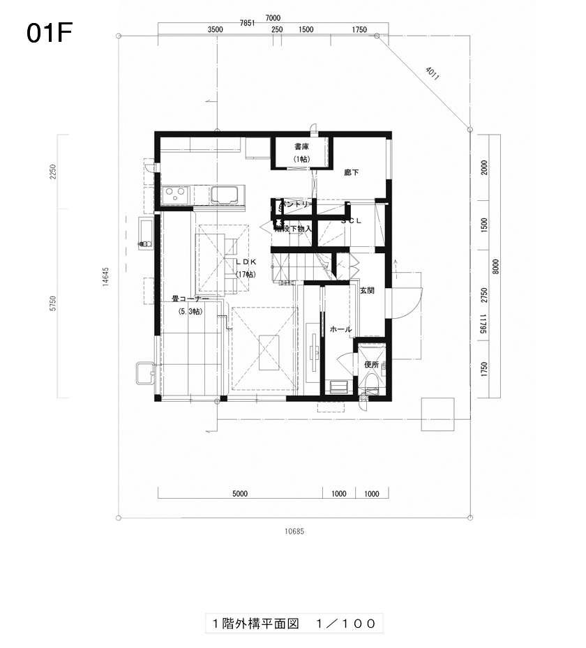 敷地は北東の角地。二階の南西から明石海峡大橋が望める立地。建物のスケールは7×8。