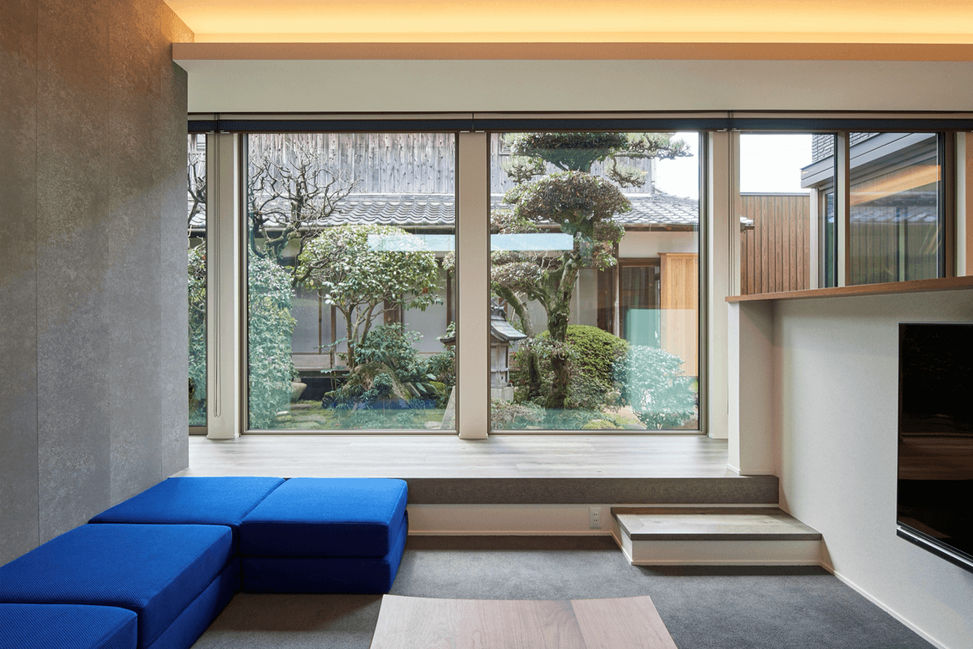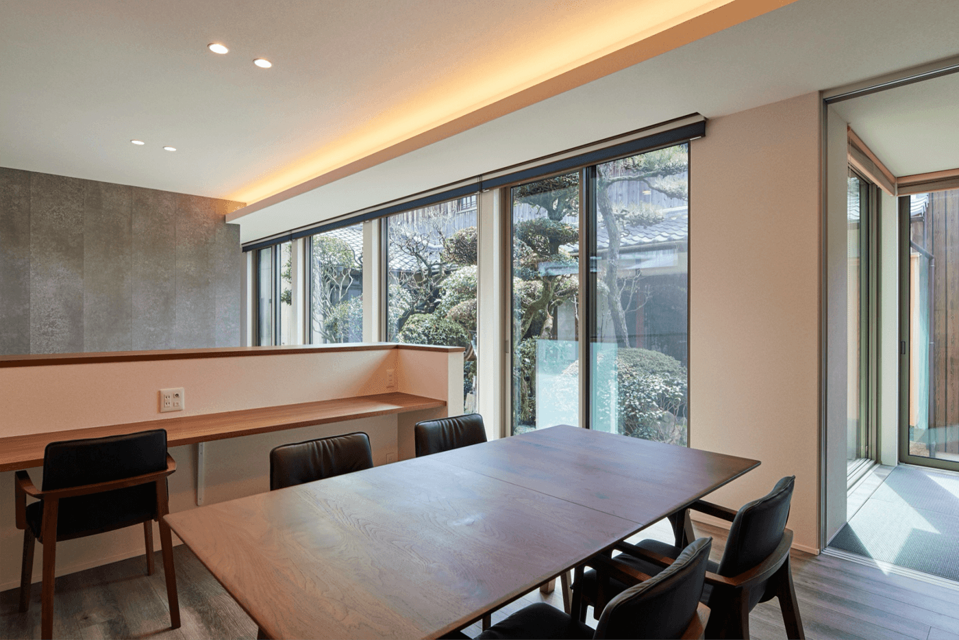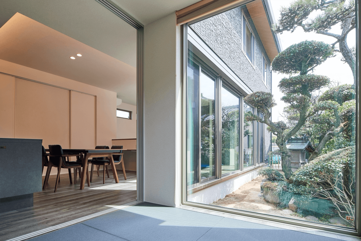 プランを変更し、素直に日当たりのいい南側を開き、母屋の和庭園を共有するコンセプトができあがりました。