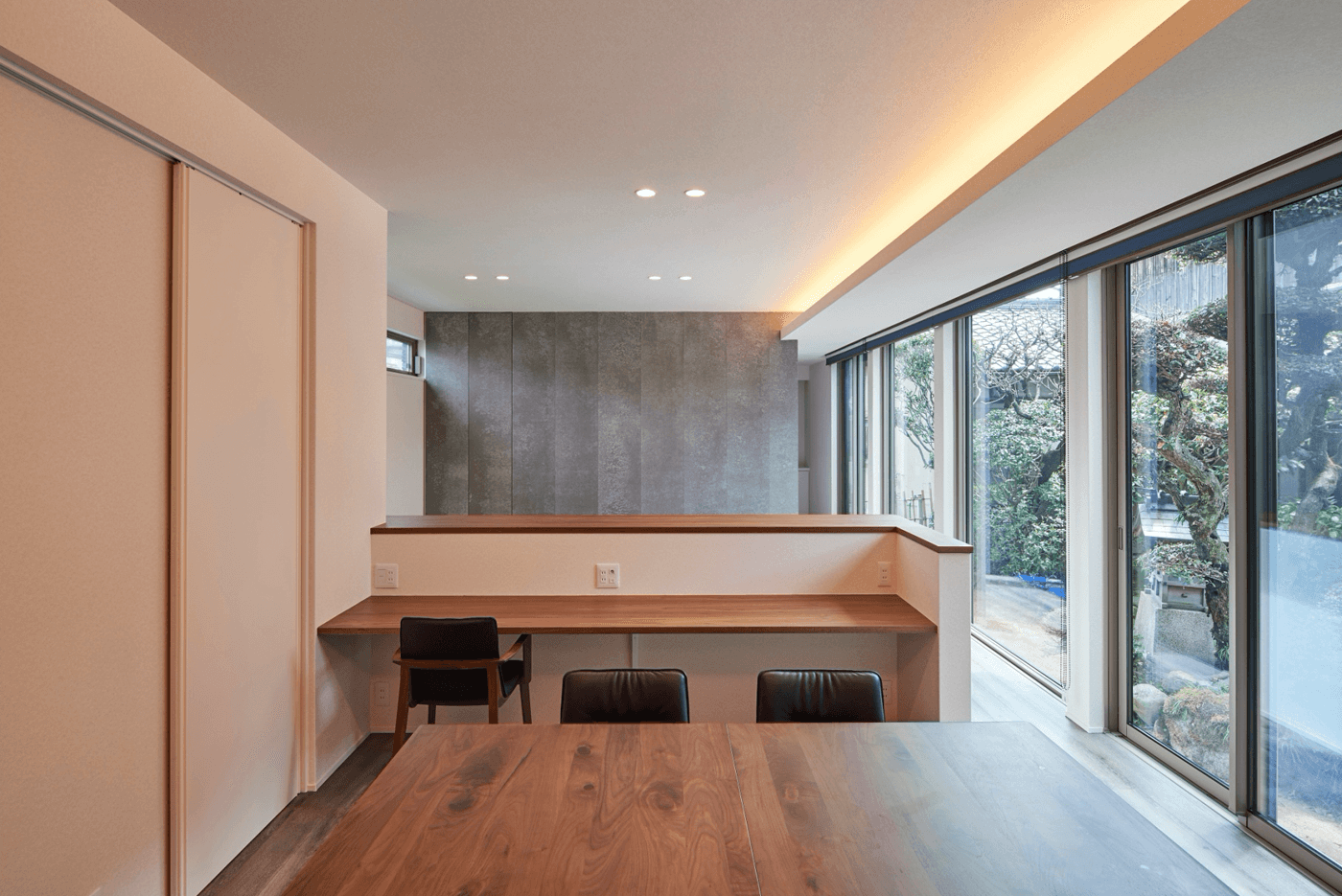 玄関からリビングへと続く壁に「ケイミューのソリド」という建材を貼り、アクセントに。その壁が扉になっていて、書斎へと続く建具の役割をしています。