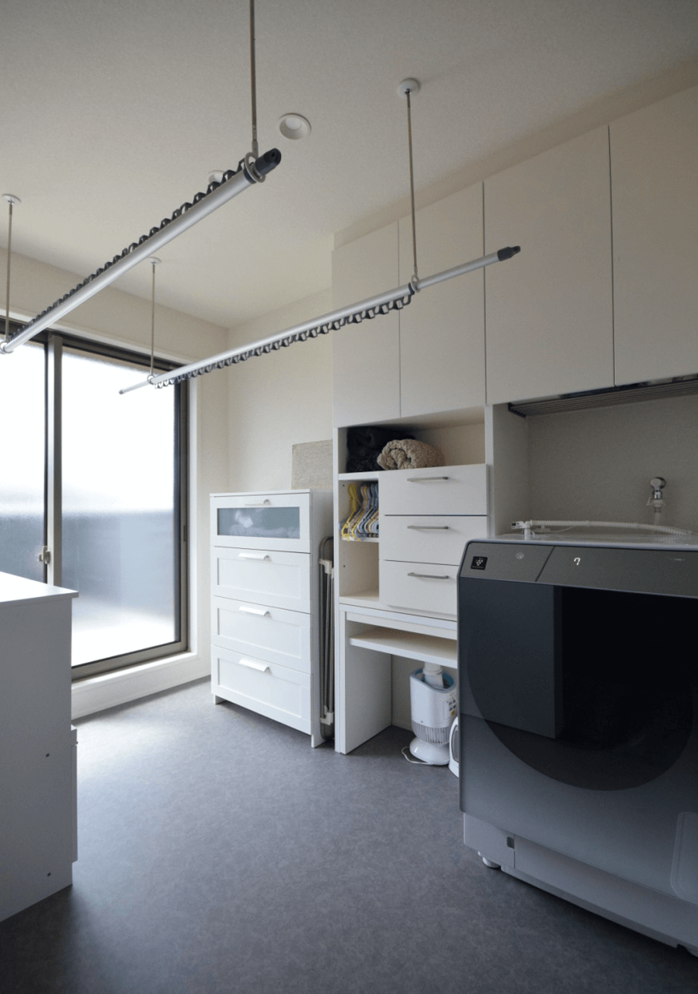 洗面は、室内干ができるように広くとり、バルコニーとつなげ、家事動線を短くしました。