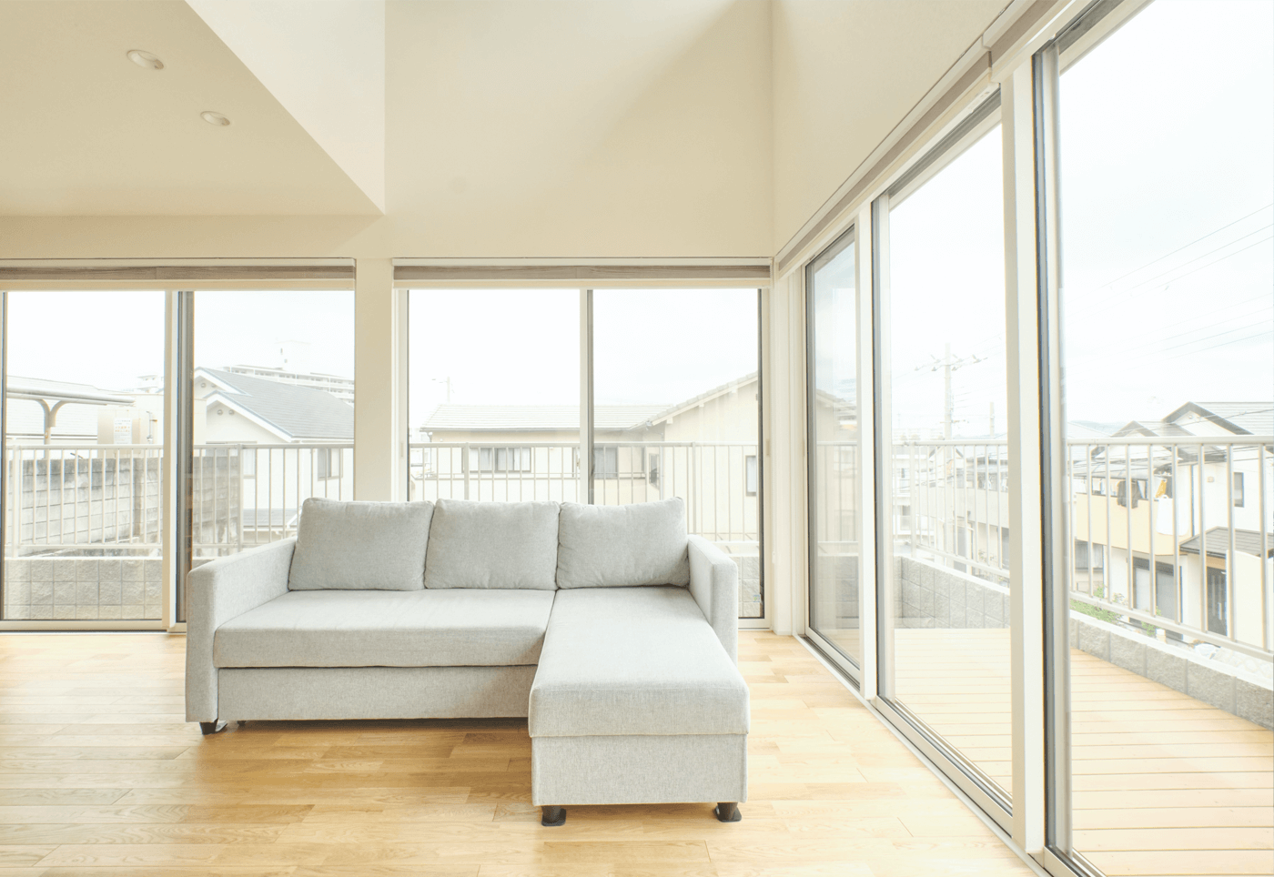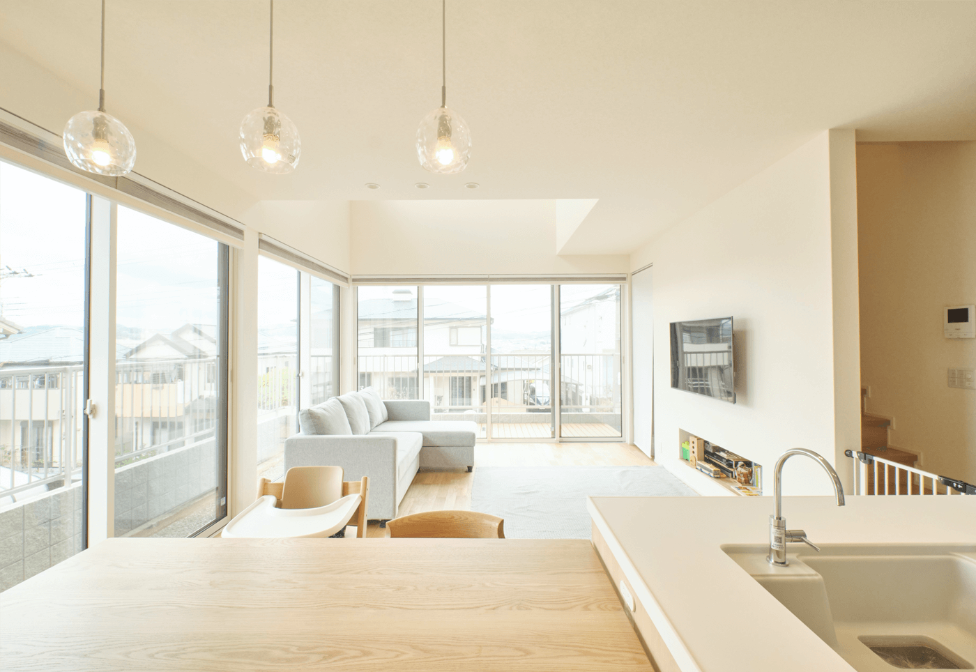 西側は隣家より手前に空き地(施主様の土地)があるので、北西のコーナーに大きく窓を取り、さらに吹き抜けとつなげることで開放的で明るいリビングが実現しました。