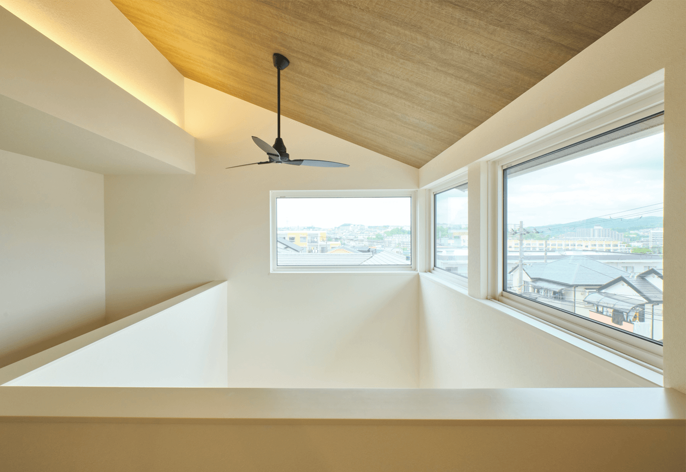 朝起きて、部屋から出ると、吹き抜けを介して、窓の外に広がる街並みの広々とした景観を望むことができるように設計しています。