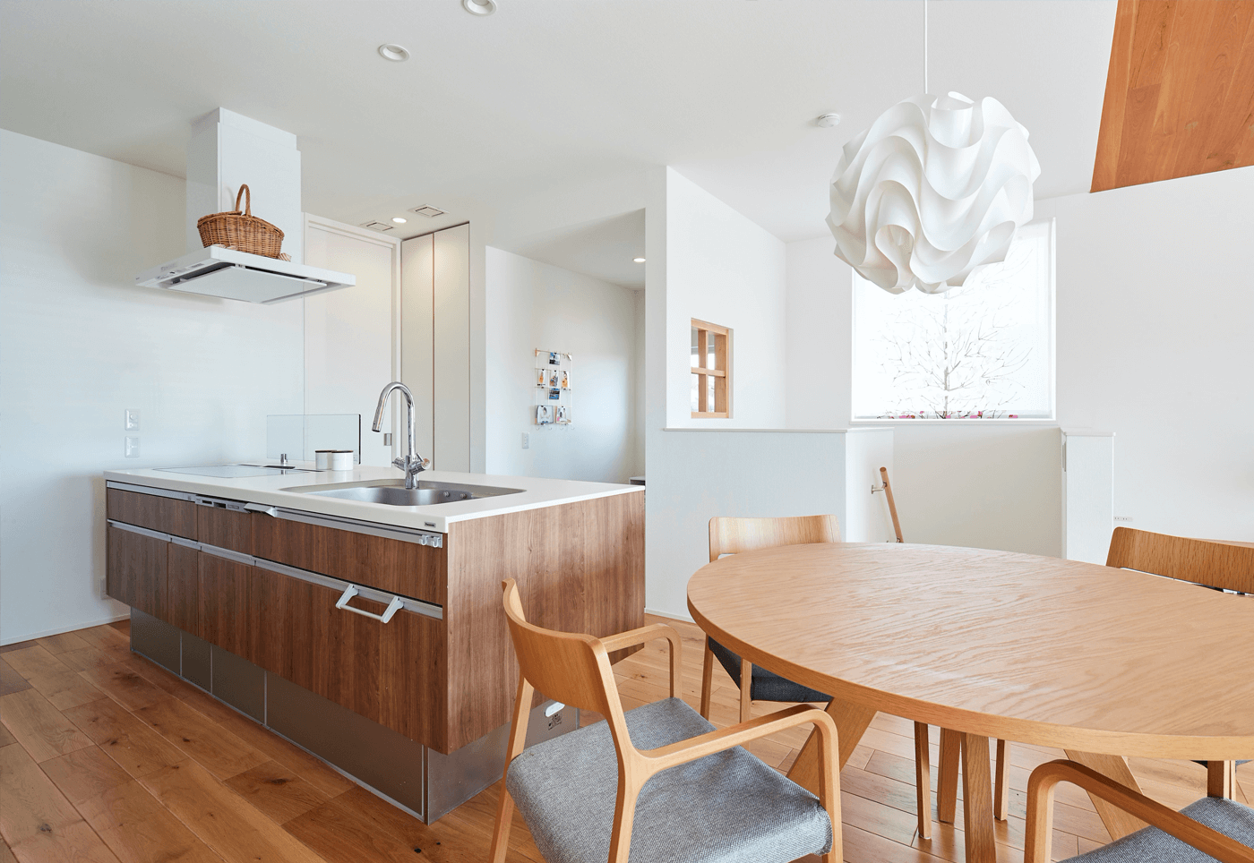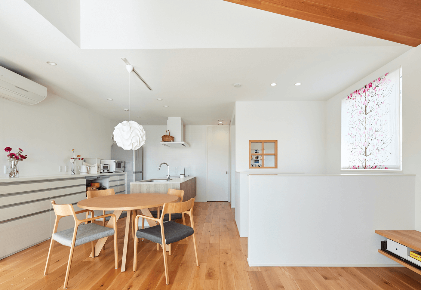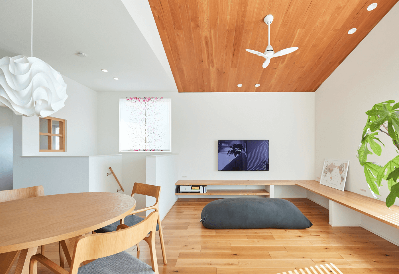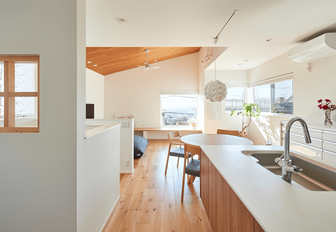 #二階リビング #ベンチ #折り上げ天井 #室内干し #アイランドキッチン #木目パネル #丸テーブル #片流れ屋根 #ベルバーン