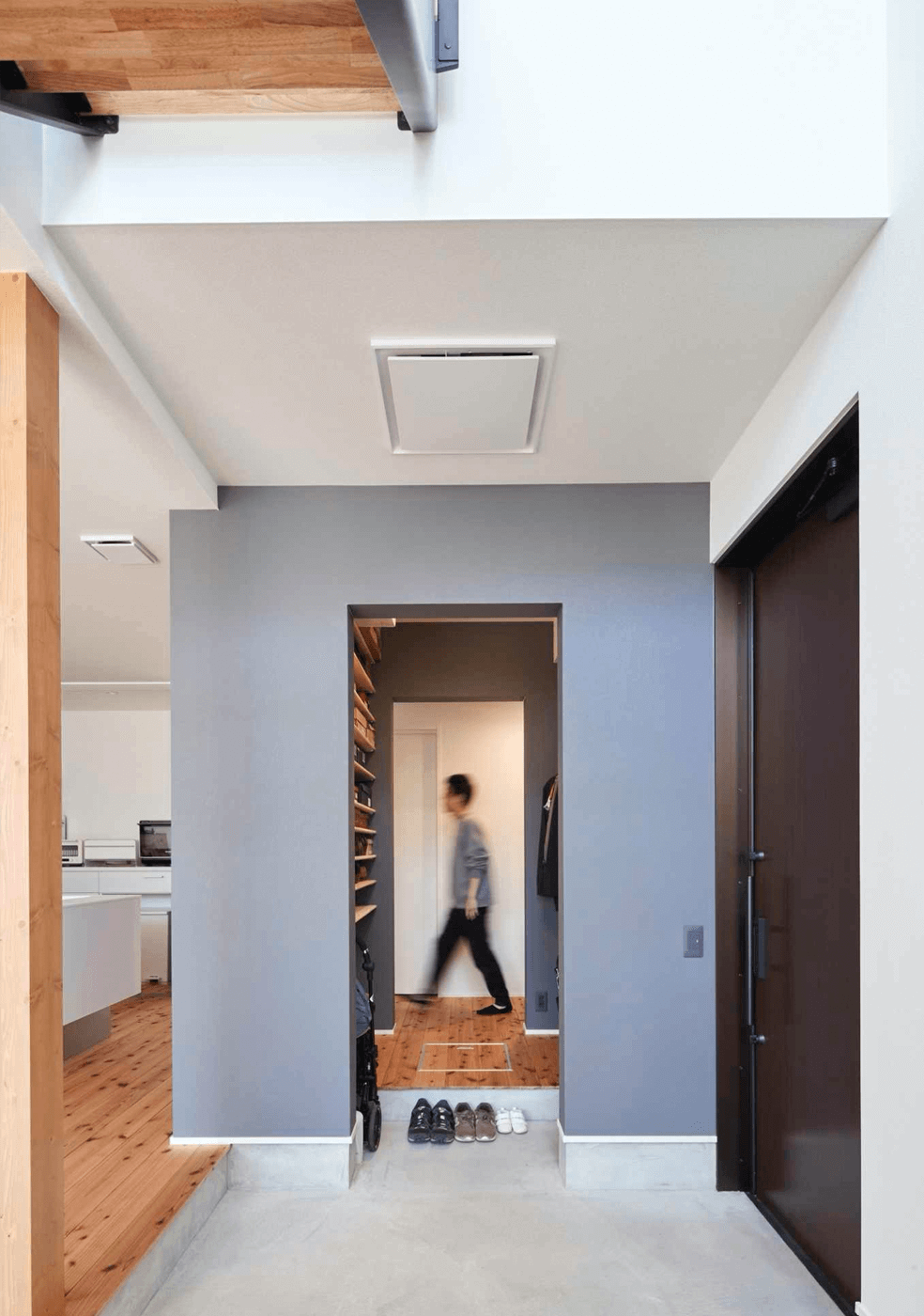 #土間 #シースルー階段 #杉無垢床 #アイランドキッチン #グレー #共働き #2階洗面バス #書斎 #吹抜け #モディファイ #間接照明
