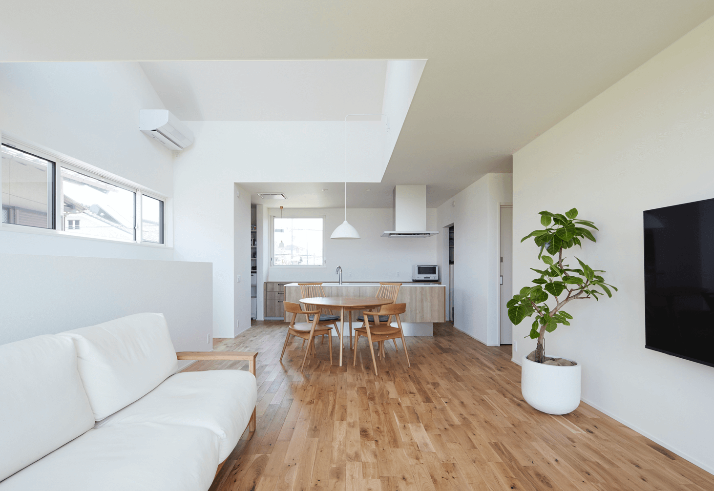 2階リビングの特性を活かし、屋根勾配にあわせて天井が高くなる勾配天井を採用しました。