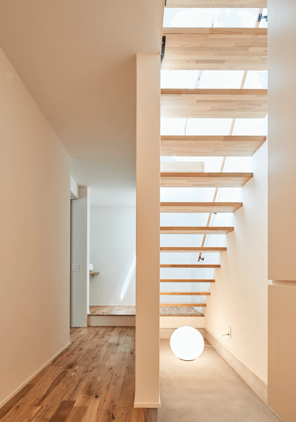 玄関はシースルー階段を採用し、奥行き感ある空間に。