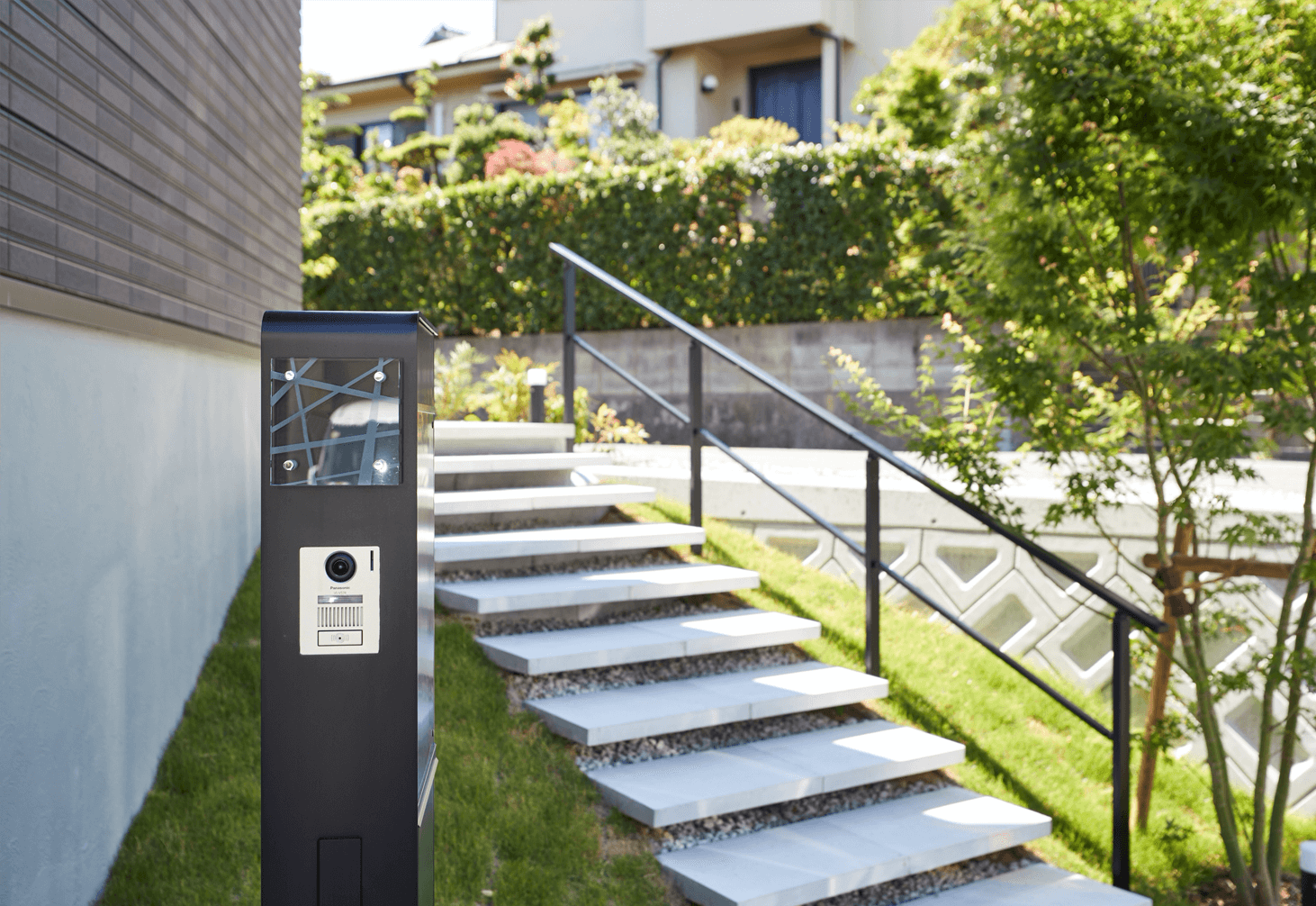 道路の低い場所に駐車場、宅盤の高い場所に玄関を配置し、階段のアプローチをつくりました。