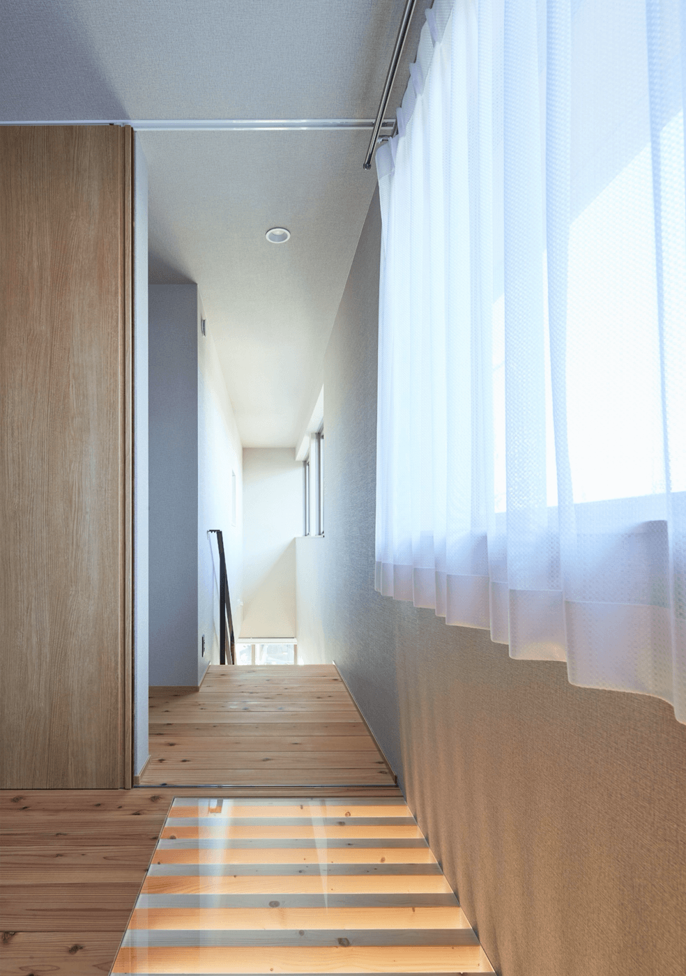 吹抜けから光を通し、2階では、そのすのこの上を歩くことができます。