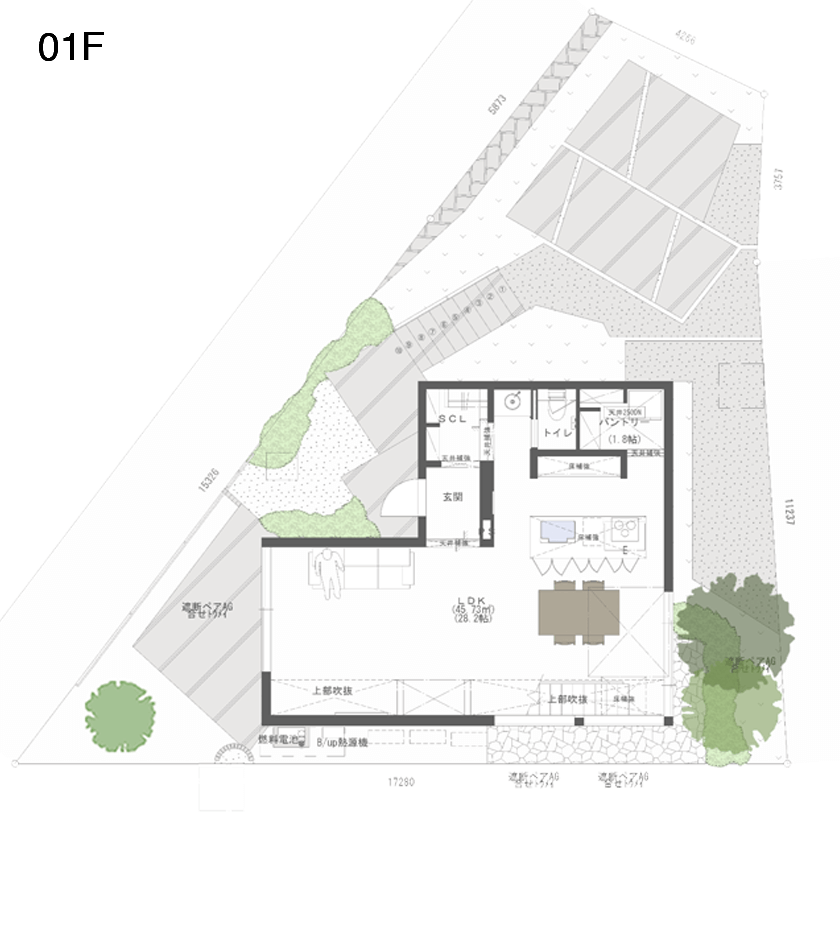 北側は、リビングと土間テラスをつなぎ、お子様が土いじりもできるように提案して、採用頂きました。