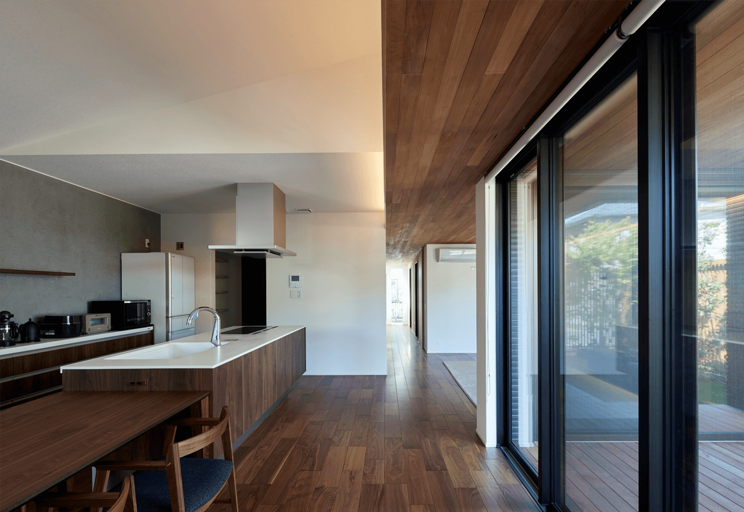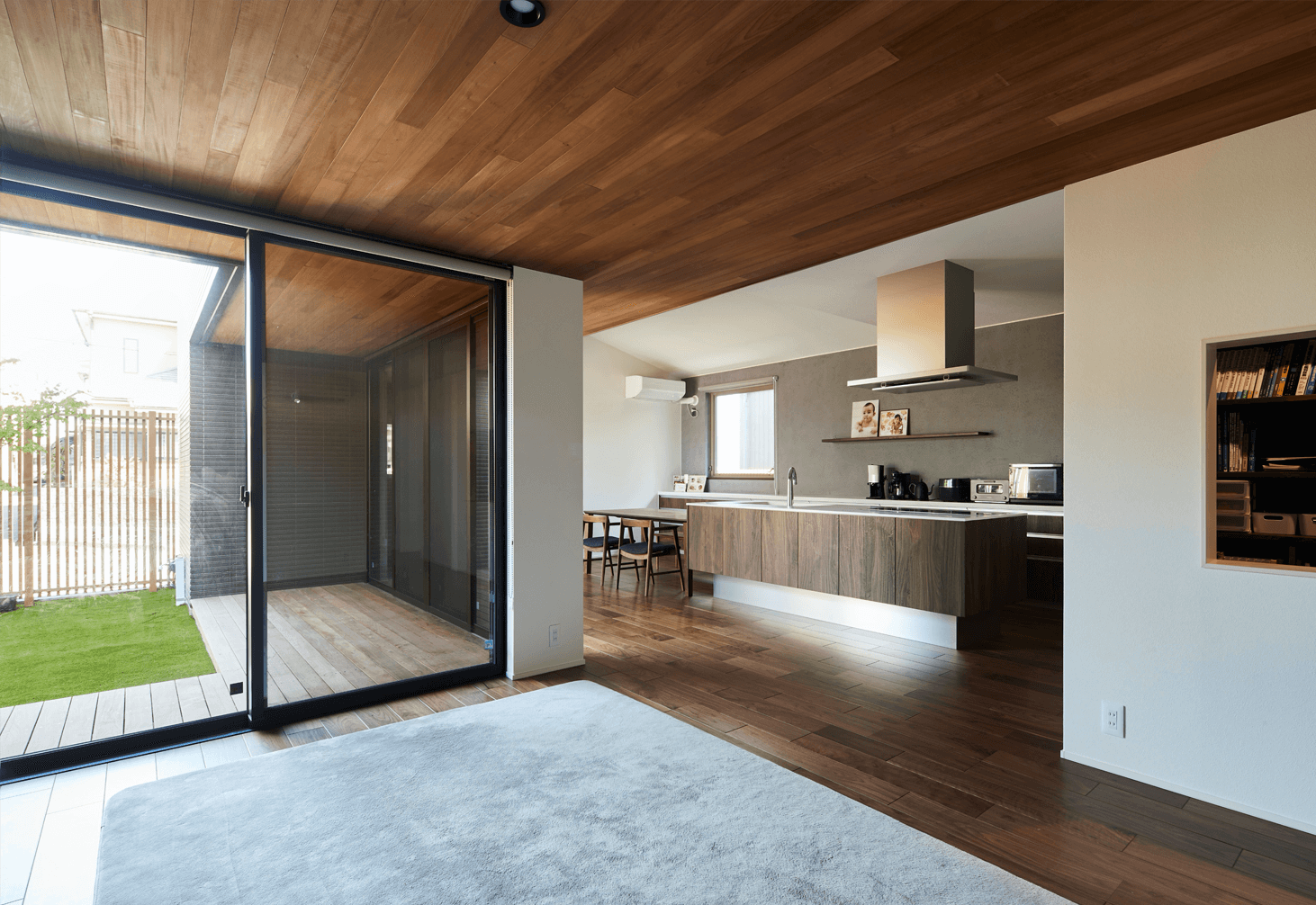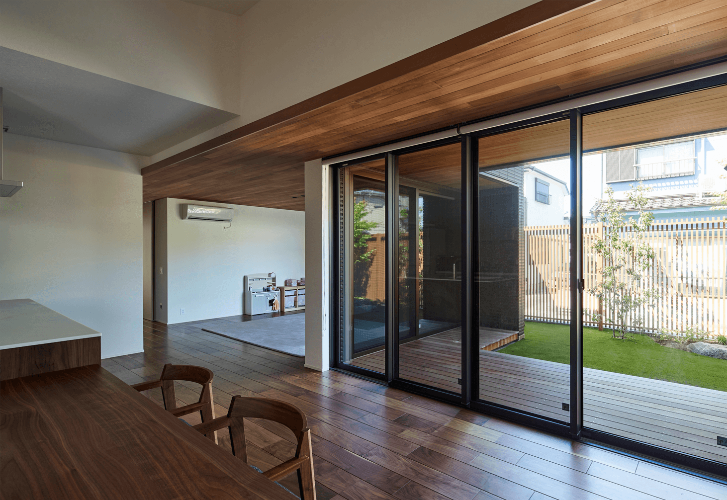 外壁のベルバーンを室内の一部にも採用して連続性を持たせたり、床のウォールナットとウッドデッキ材のイペ床を繋げたり、天井材と軒裏の素材を無垢のウォールナット材で揃えるなど、ウチとソトが融合したデザインになっています。