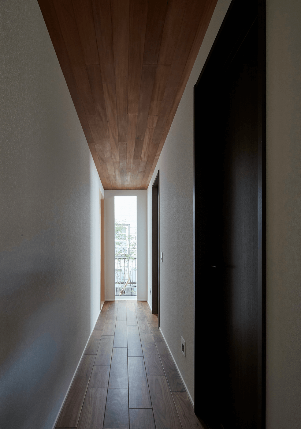 リビングの奥にぐ~んと伸びた廊下とその先の窓の景色。