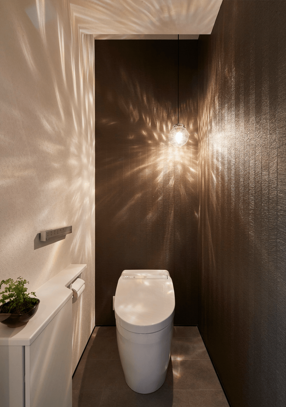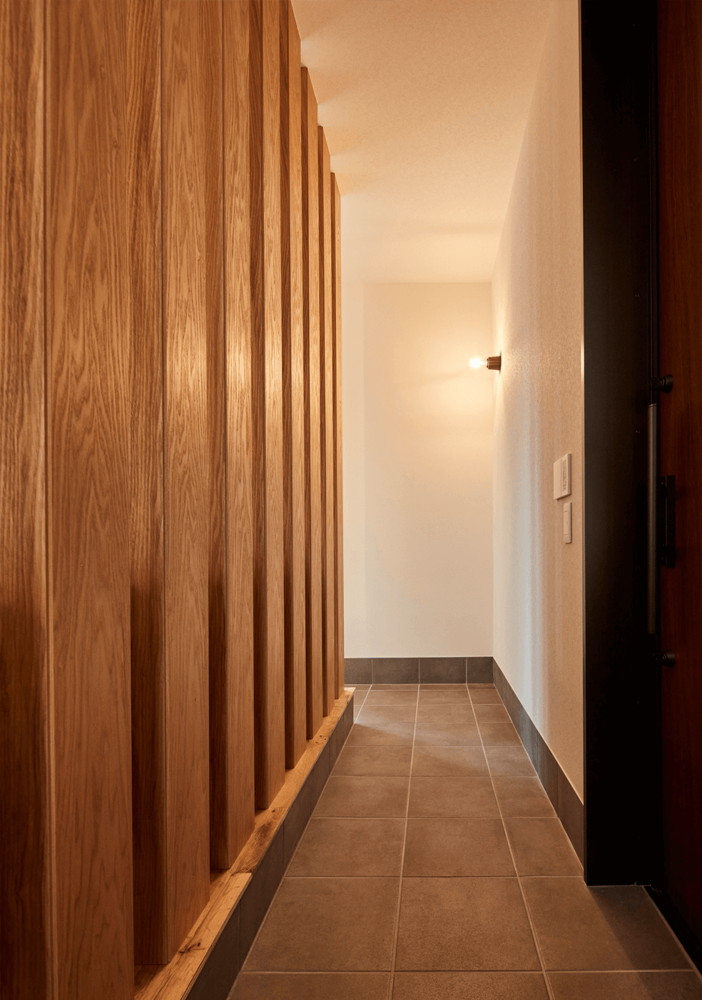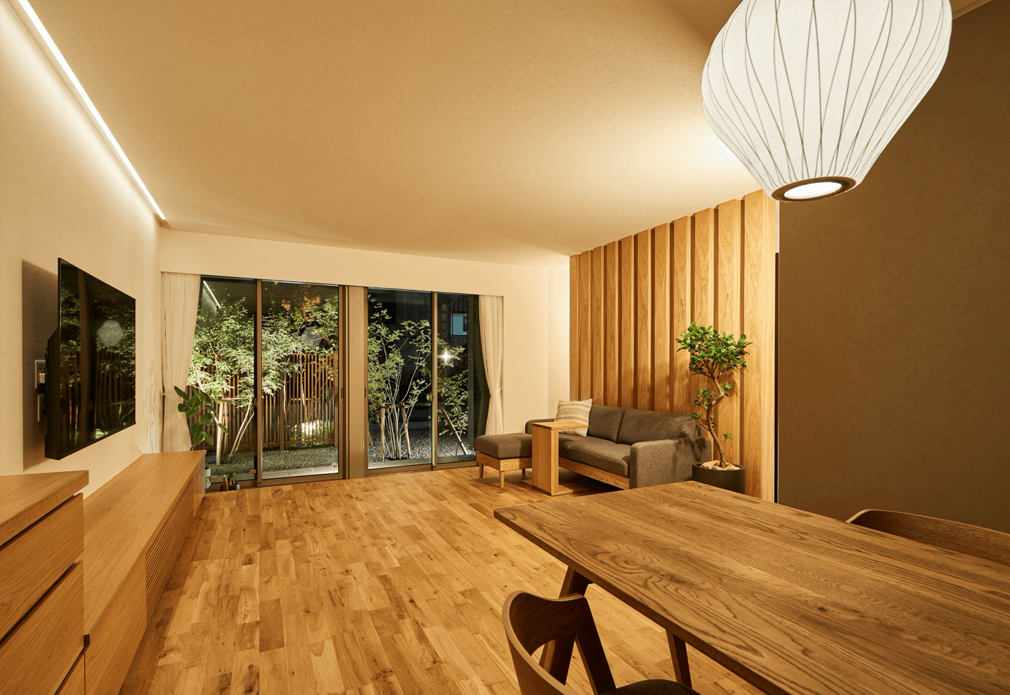夜にはライトアップされた植栽の影が軒裏に映るよう考え、邸宅感を演出しています。