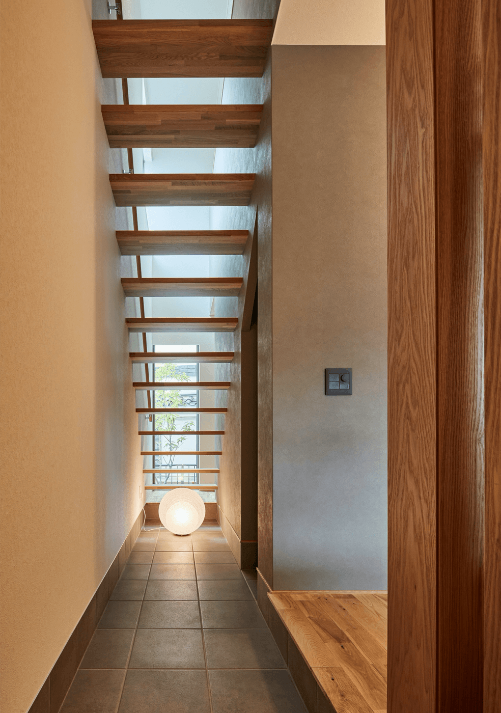 玄関→シースルー階段→窓→植栽という視線の抜け。